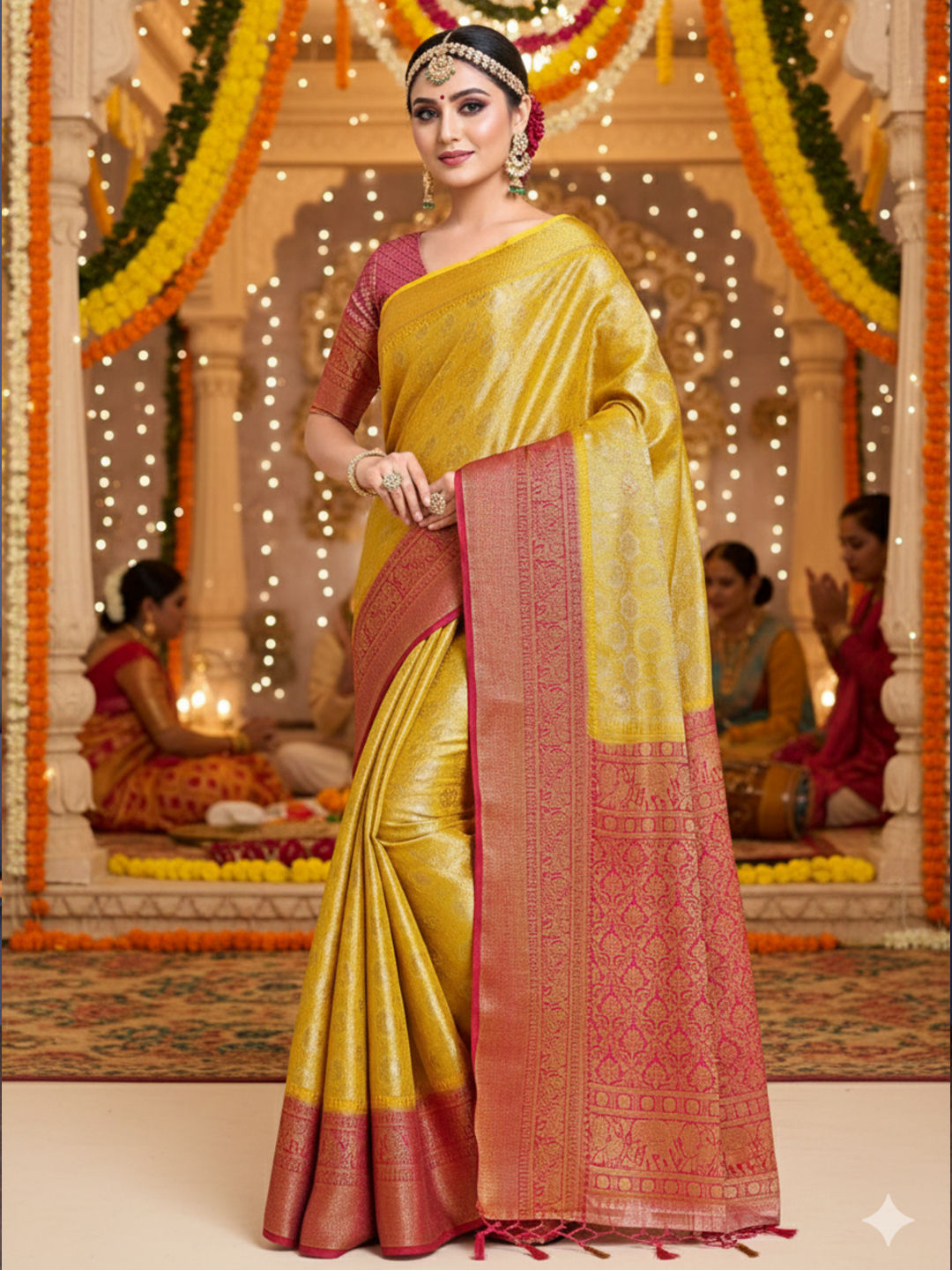 Gold color Saree in Kanjeevaram Silk fabric with Weaving, Zari, Zircon work