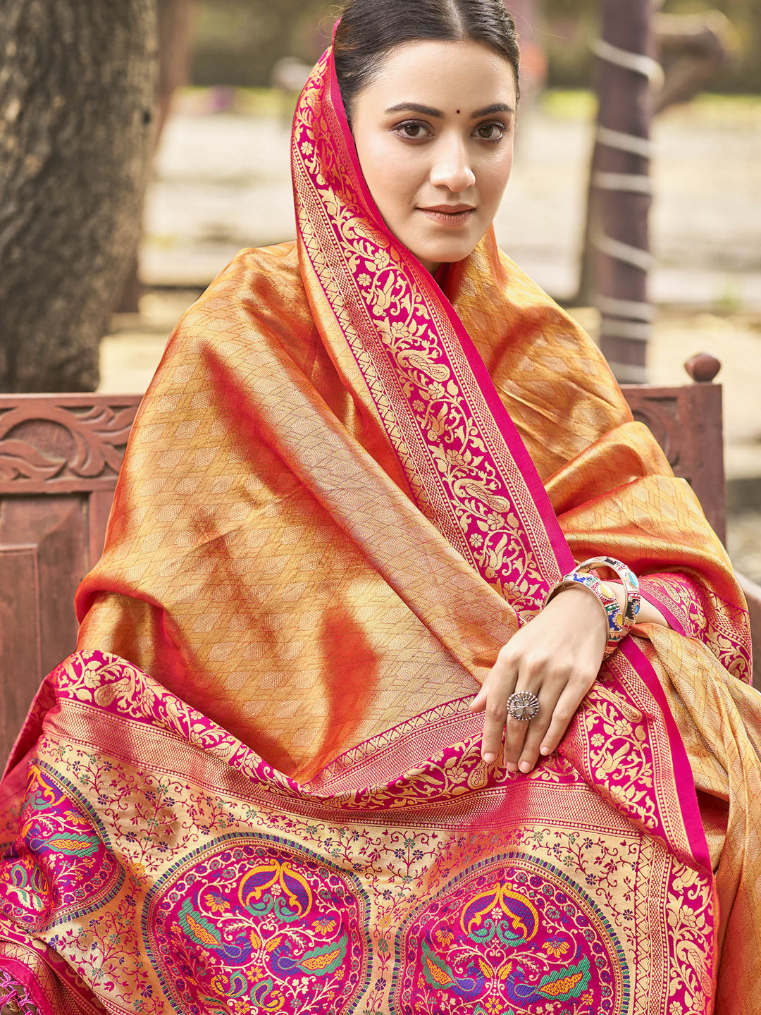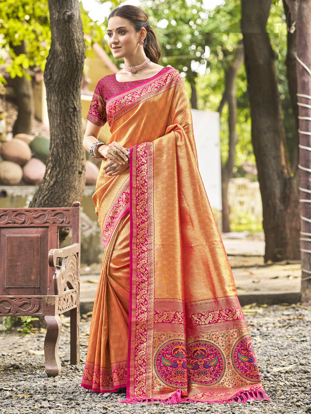 Orange color Saree in Kanjeevaram Silk fabric with Weaving work