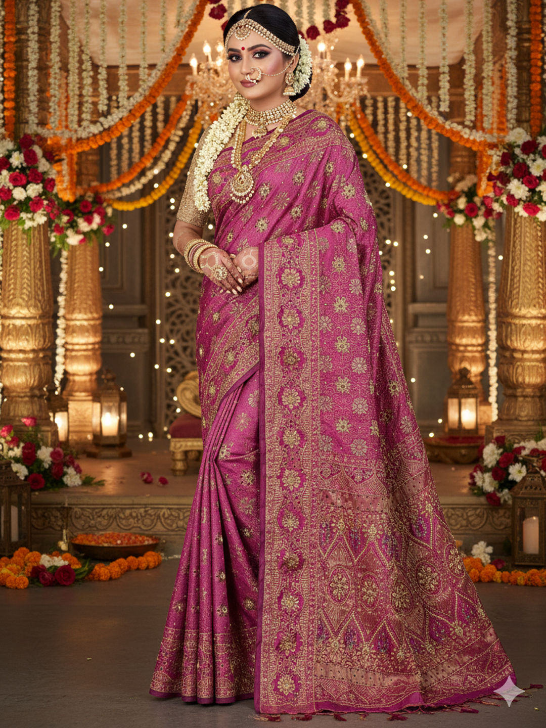 Net Bridal Saree in Pink and Majenta with Embroidered work