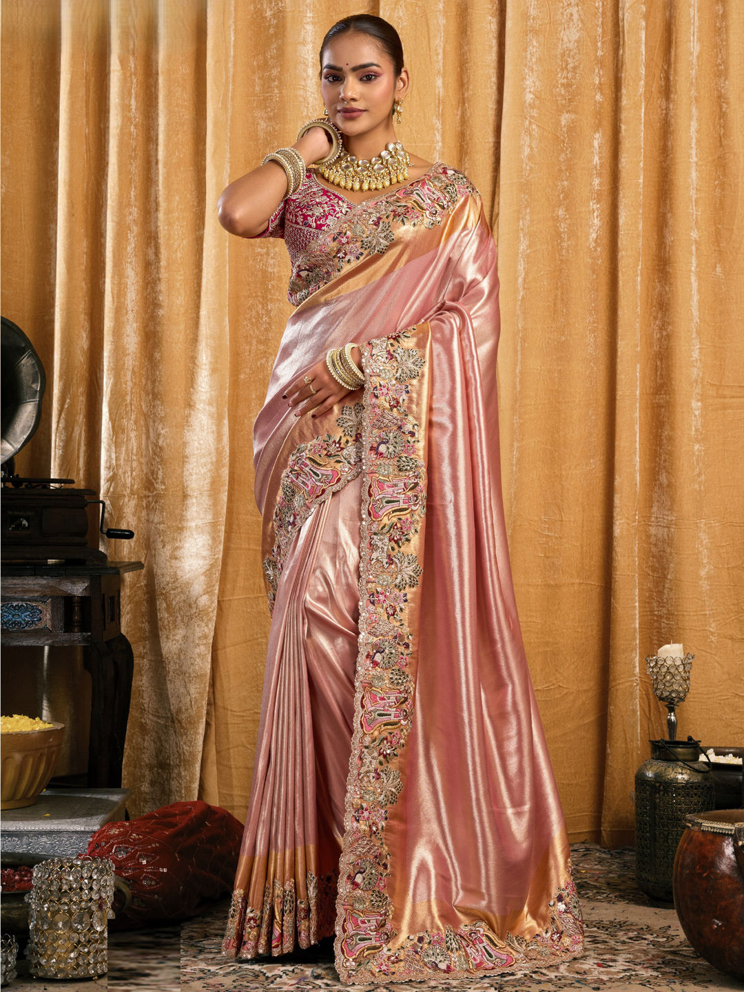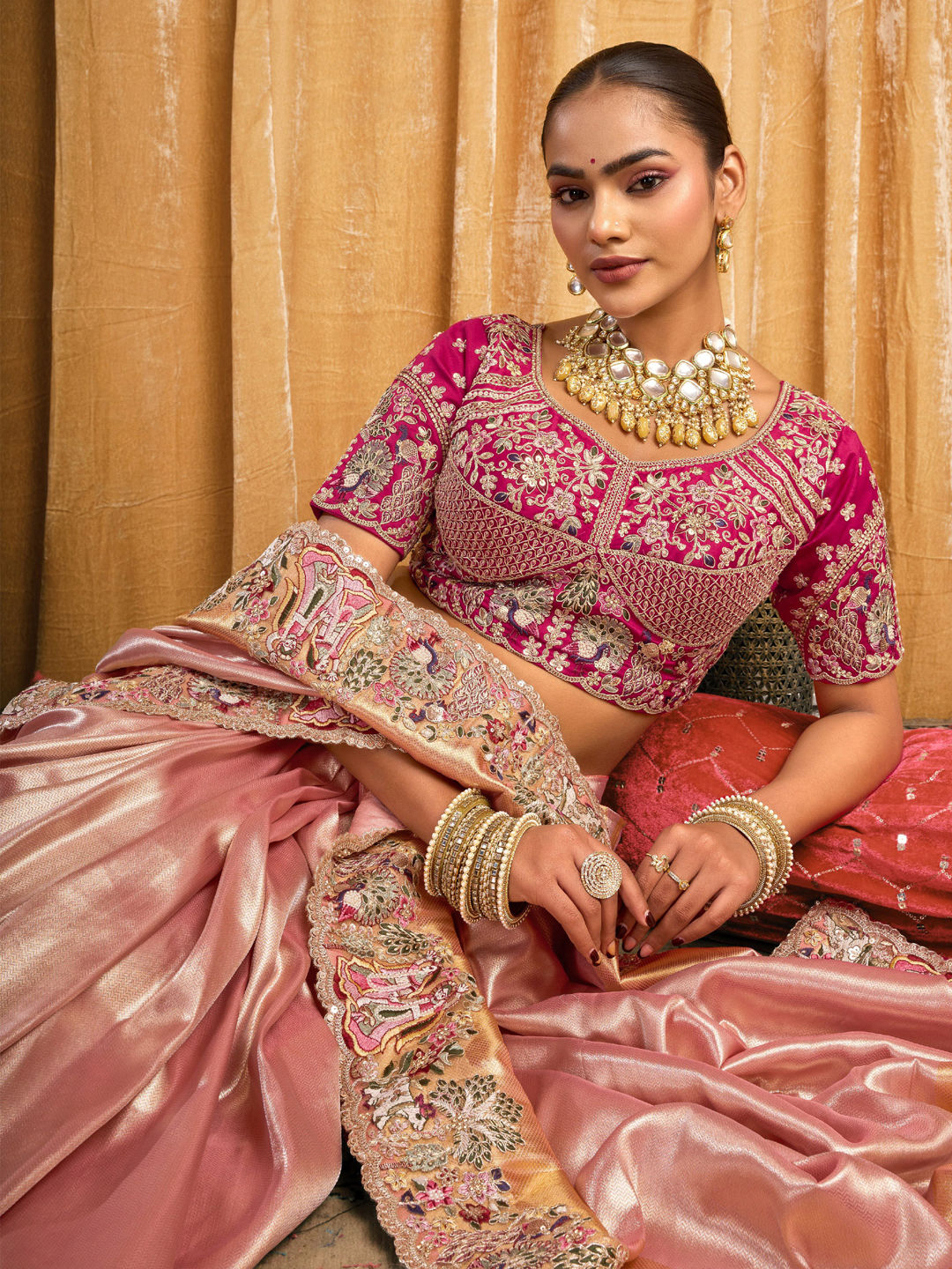 Pink and Majenta color Saree in Kanjeevaram Silk fabric with Embroidered, Moti, Sequence, Stone, Zari work