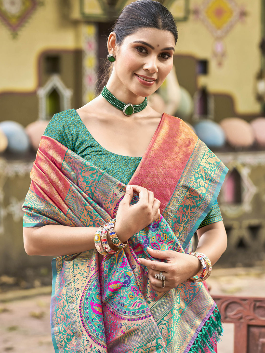 Kanjeevaram Silk Festive Saree in Green with Weaving work