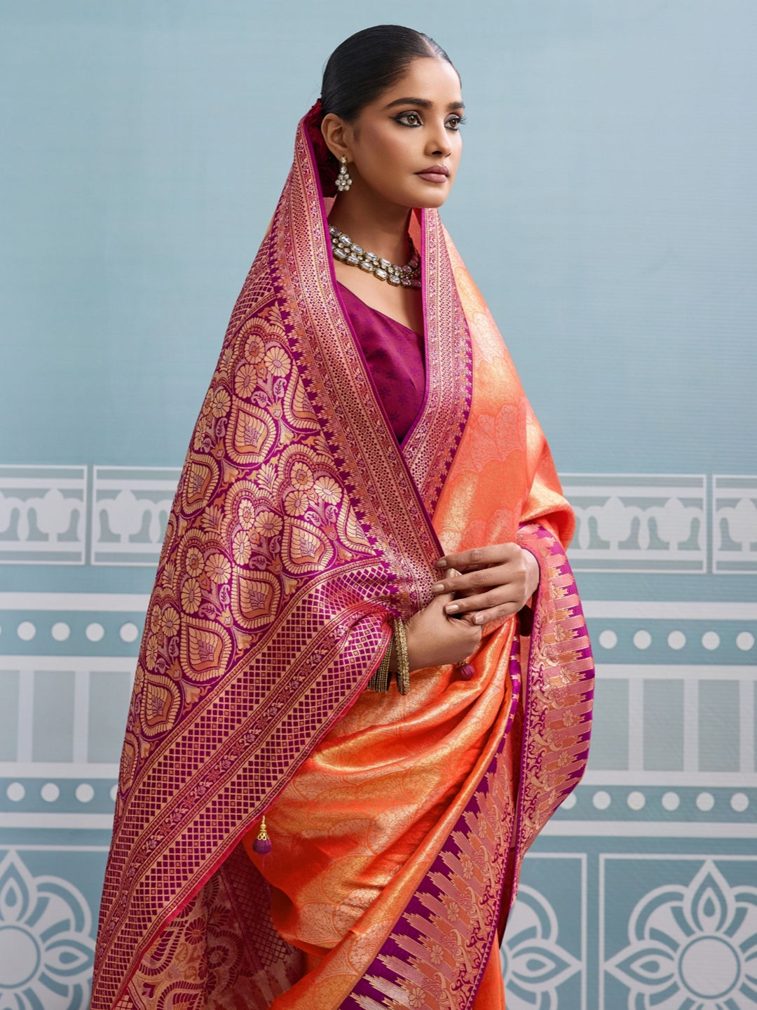 Kanjeevaram Silk Festive Saree in Orange with Border work
