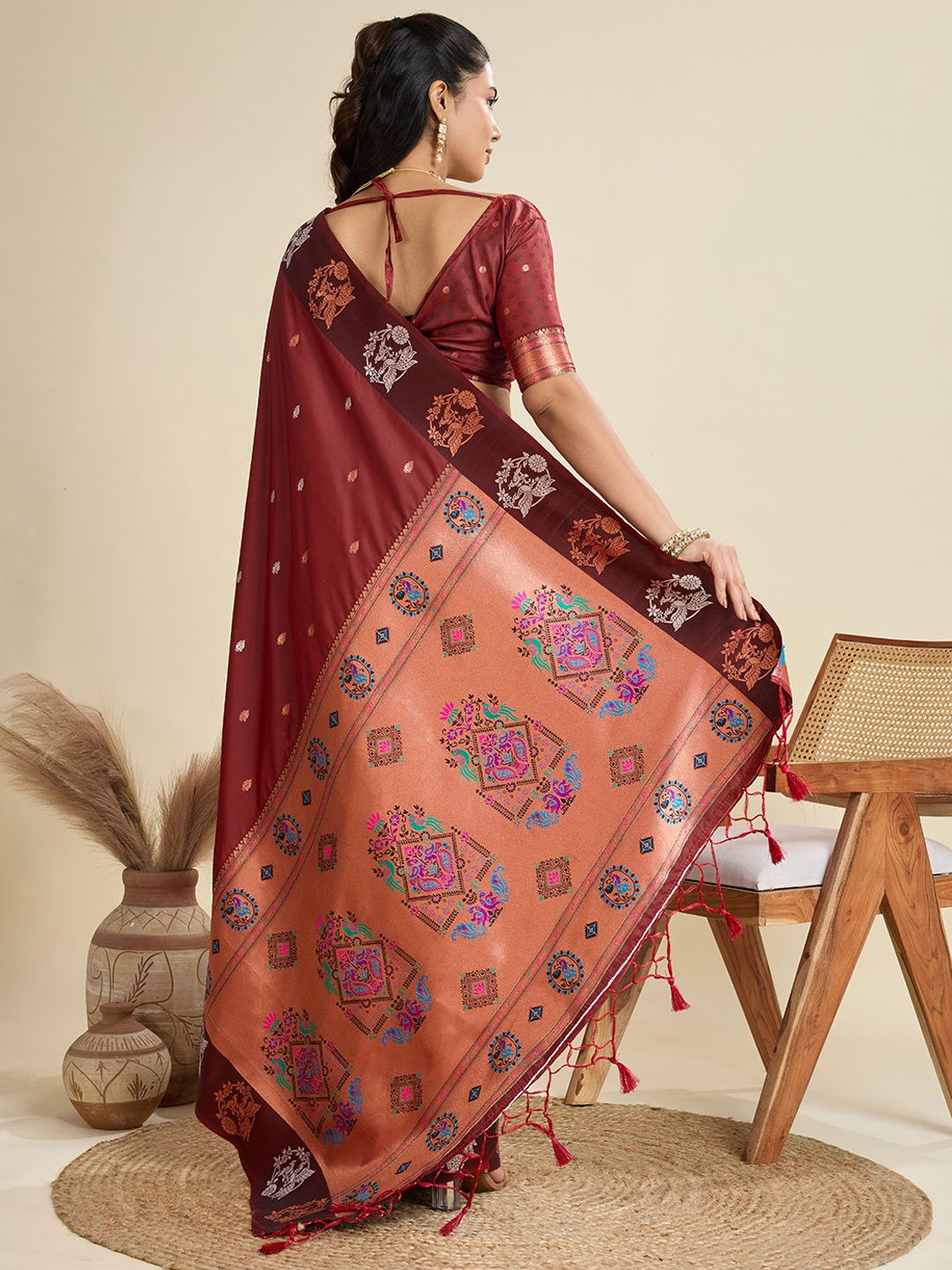 Red and Maroon color Saree in Kanjeevaram Silk fabric with Weaving work