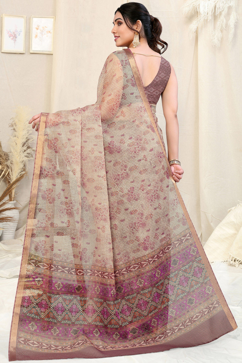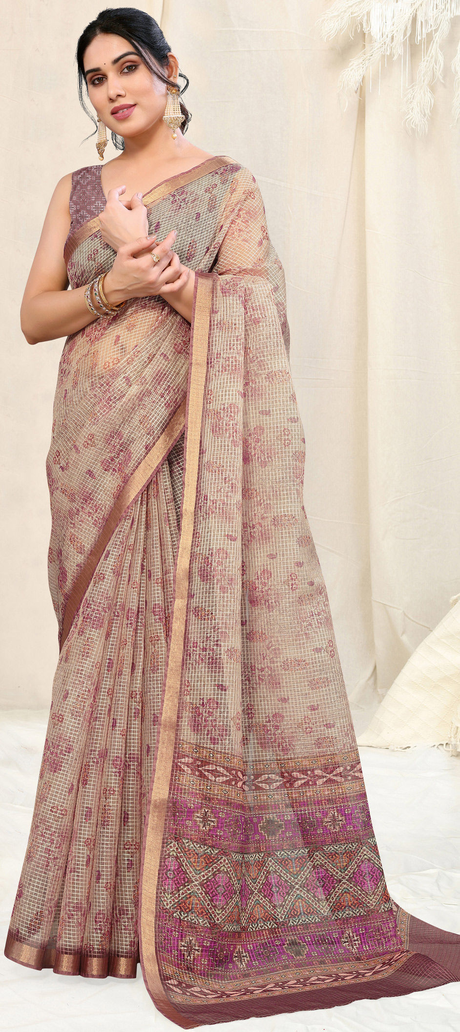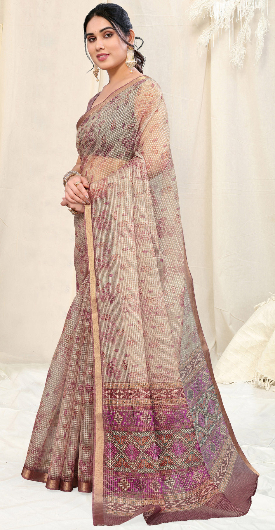 Beige and Brown color Saree in Kota Doria Silk fabric with Printed work
