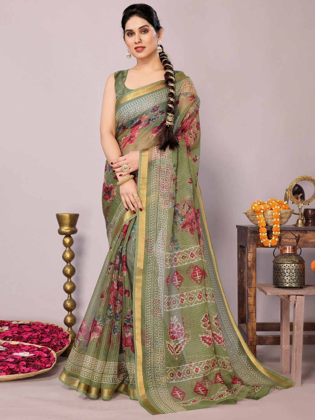 Kota Doria Silk Festive Saree in Green with Floral work