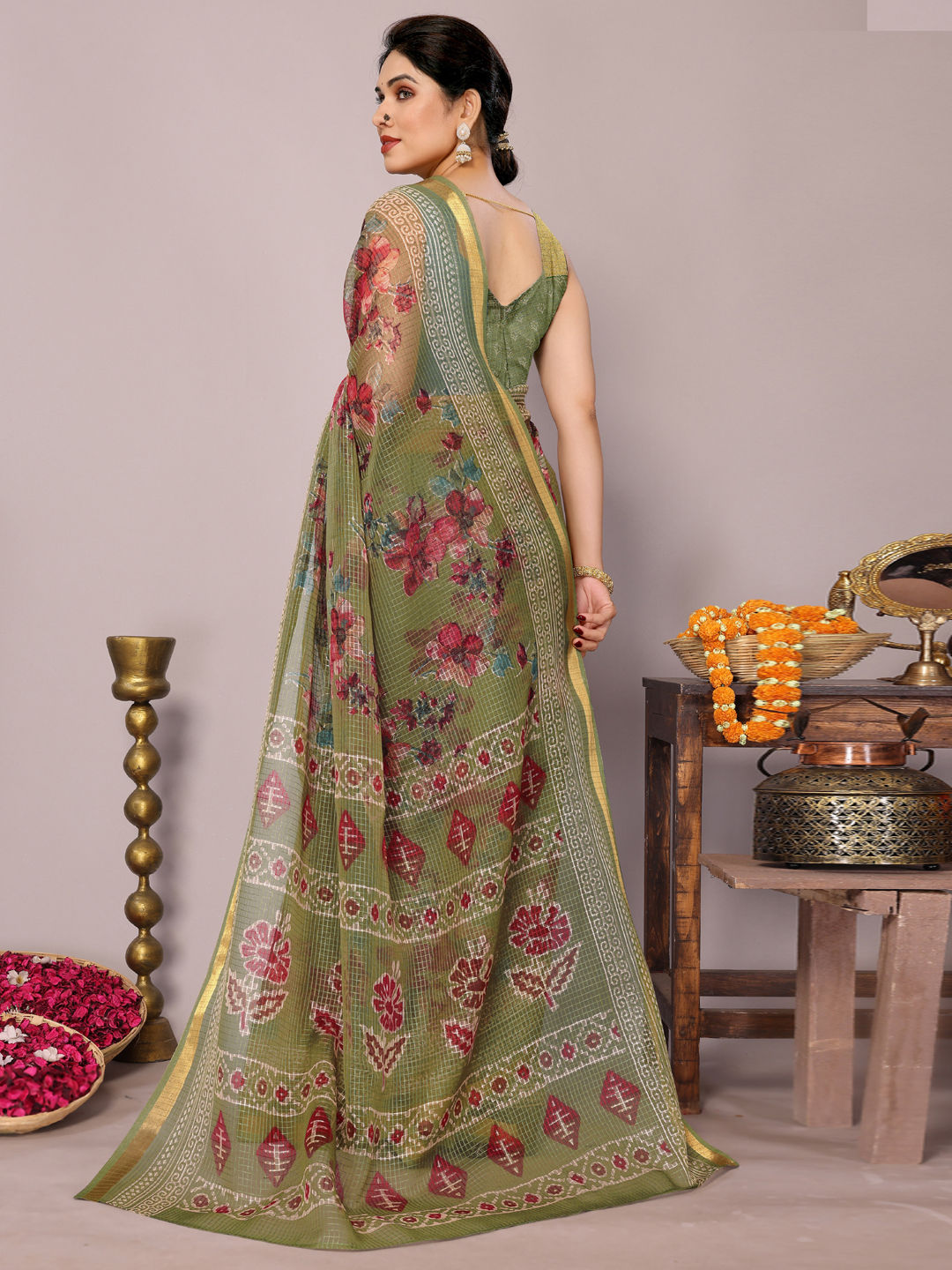 Green color Saree in Kota Doria Silk fabric with Floral, Printed work
