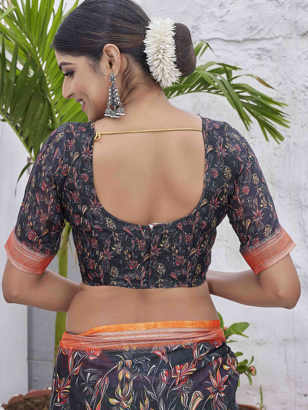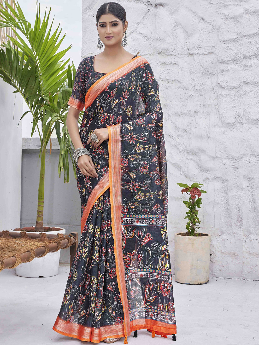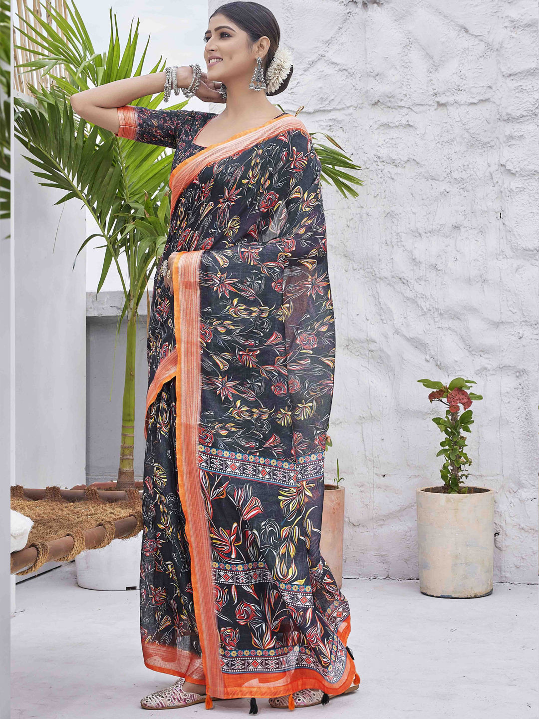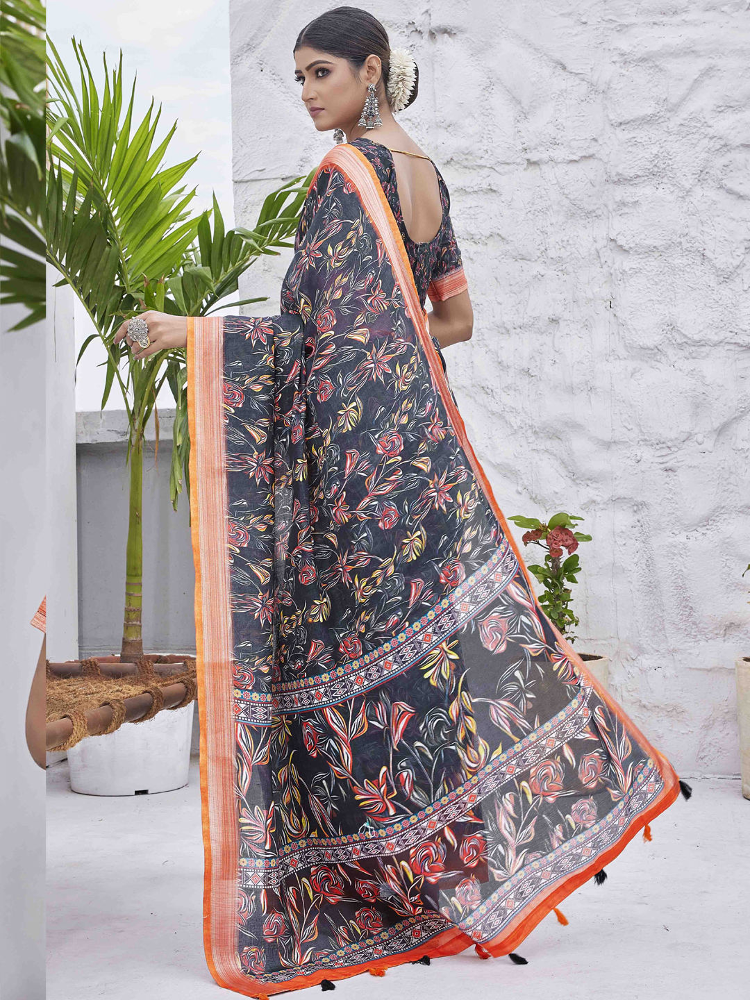 Black and Grey color Saree in Linen fabric with Digital Print work