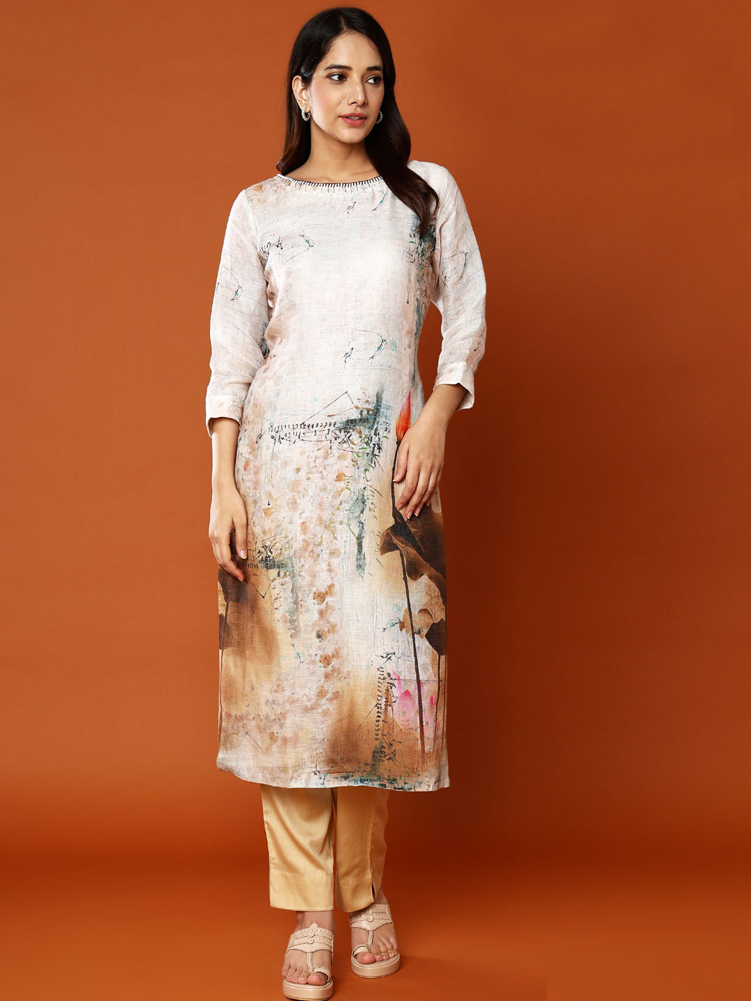 Beige and Brown color Salwar Kameez in Linen fabric with Printed work