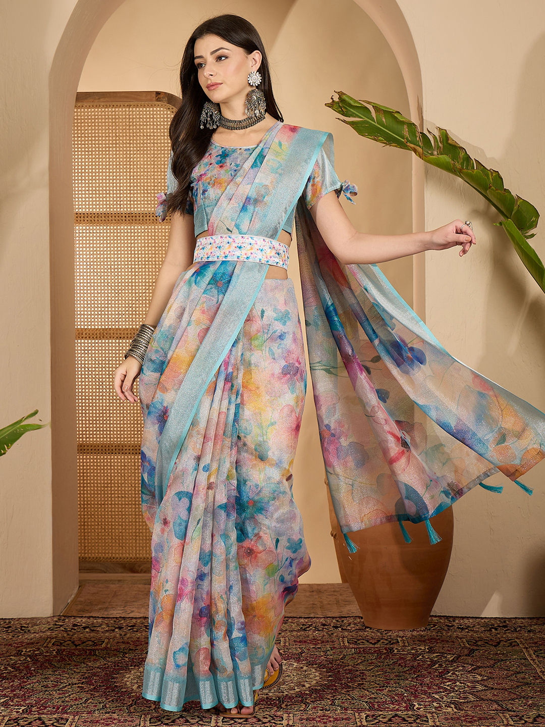 Blue color Saree in Linen fabric with Digital Print, Floral, Weaving, Zari work