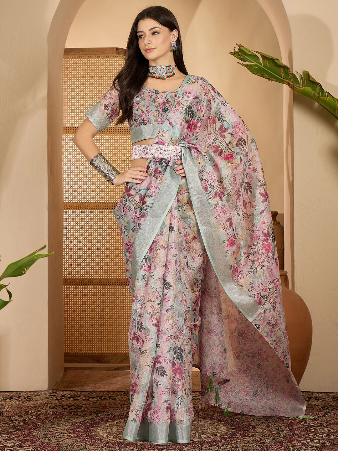 Linen Festive Saree in Multicolor with Floral work