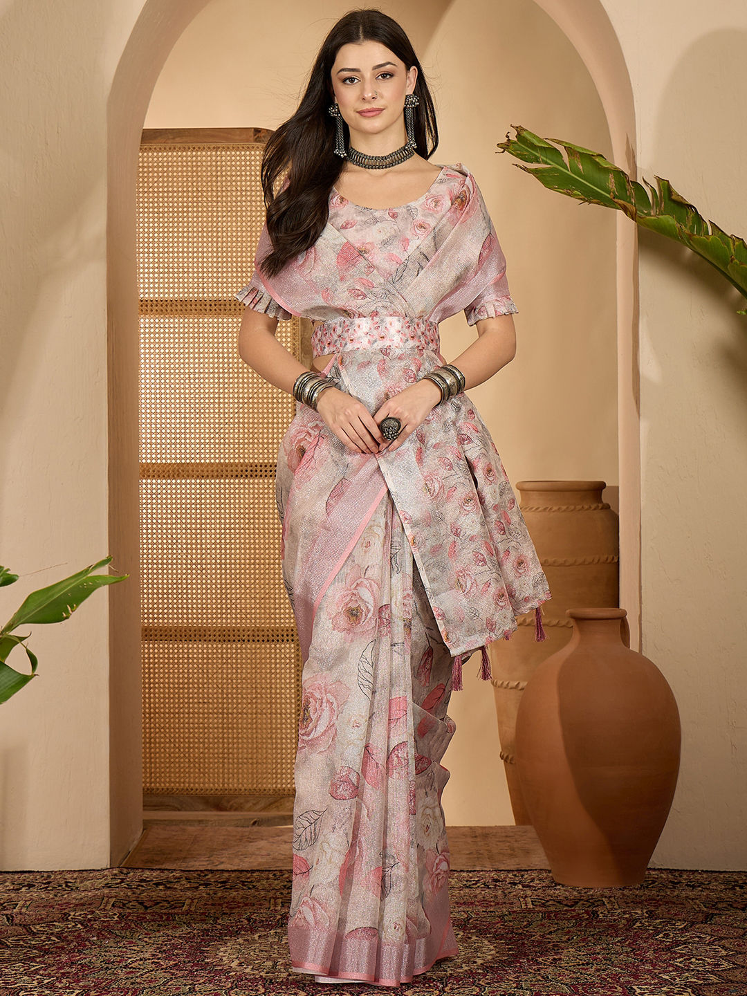 Pink and Majenta color Saree in Linen fabric with Digital Print, Floral, Weaving, Zari work