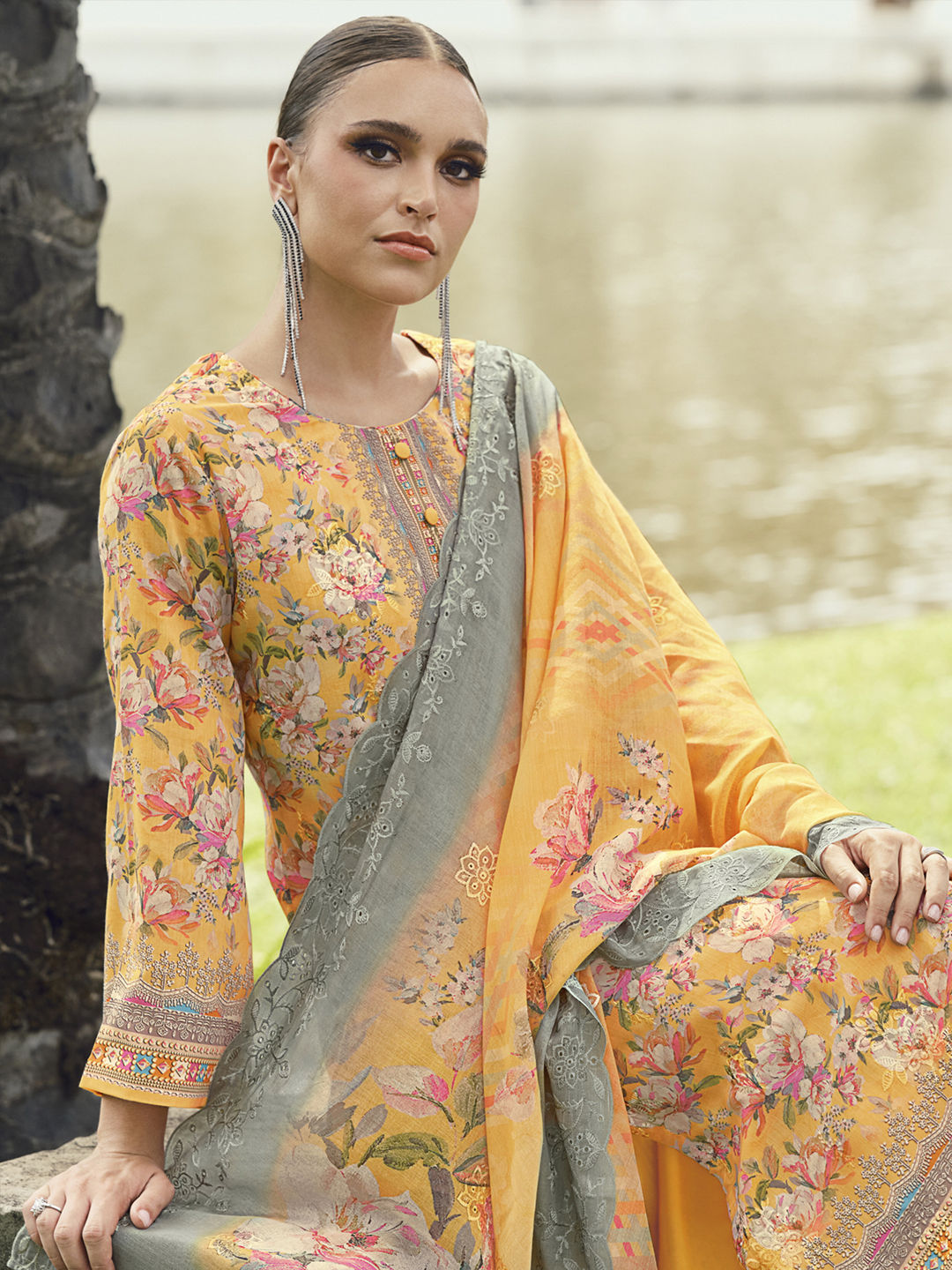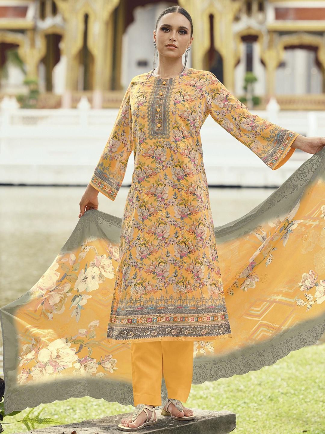 Yellow color Salwar Kameez in Cotton, Linen fabric with Digital Print, Floral, Resham, Thread work