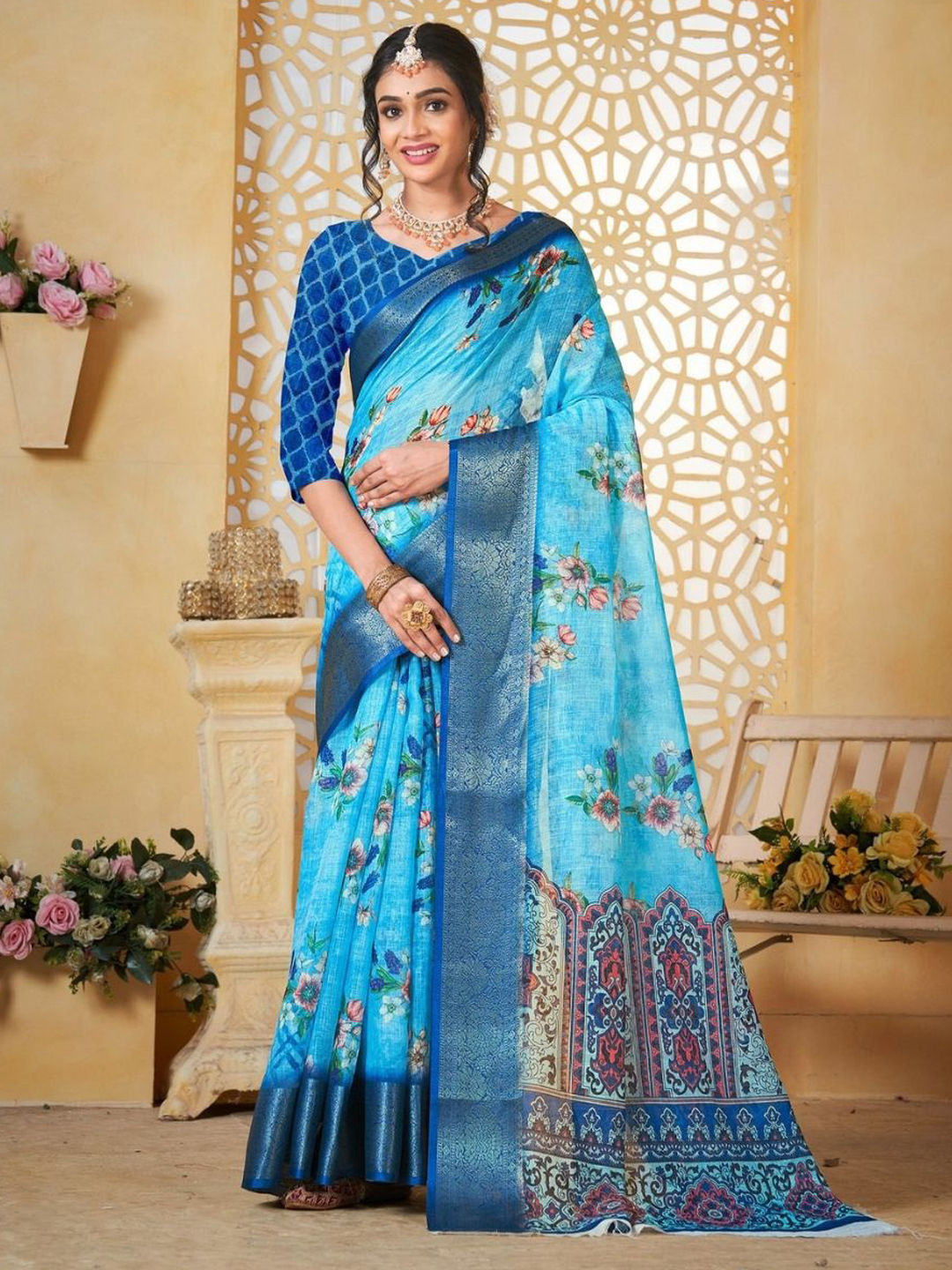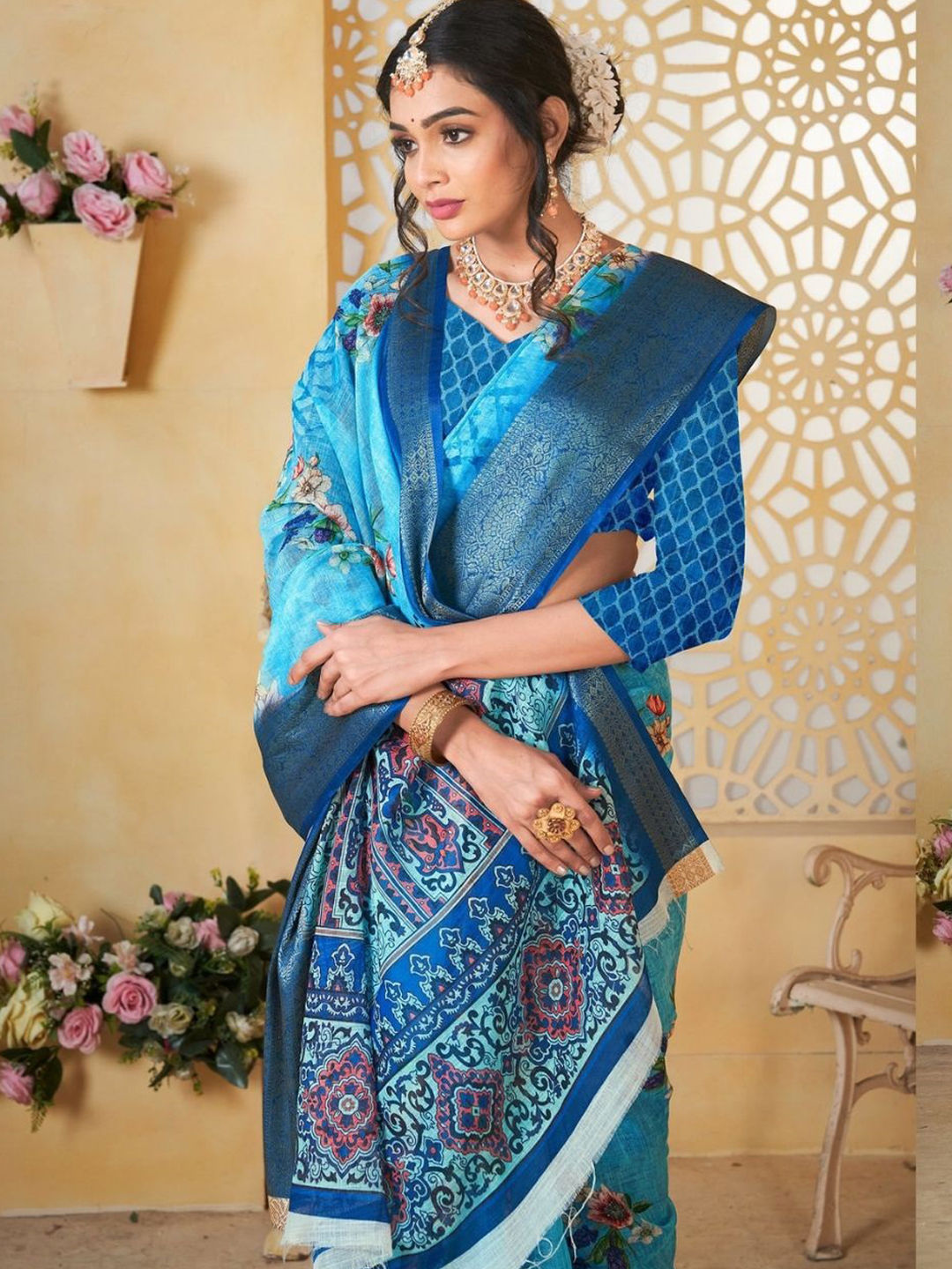 Blue color Saree in Linen fabric with Floral, Printed work