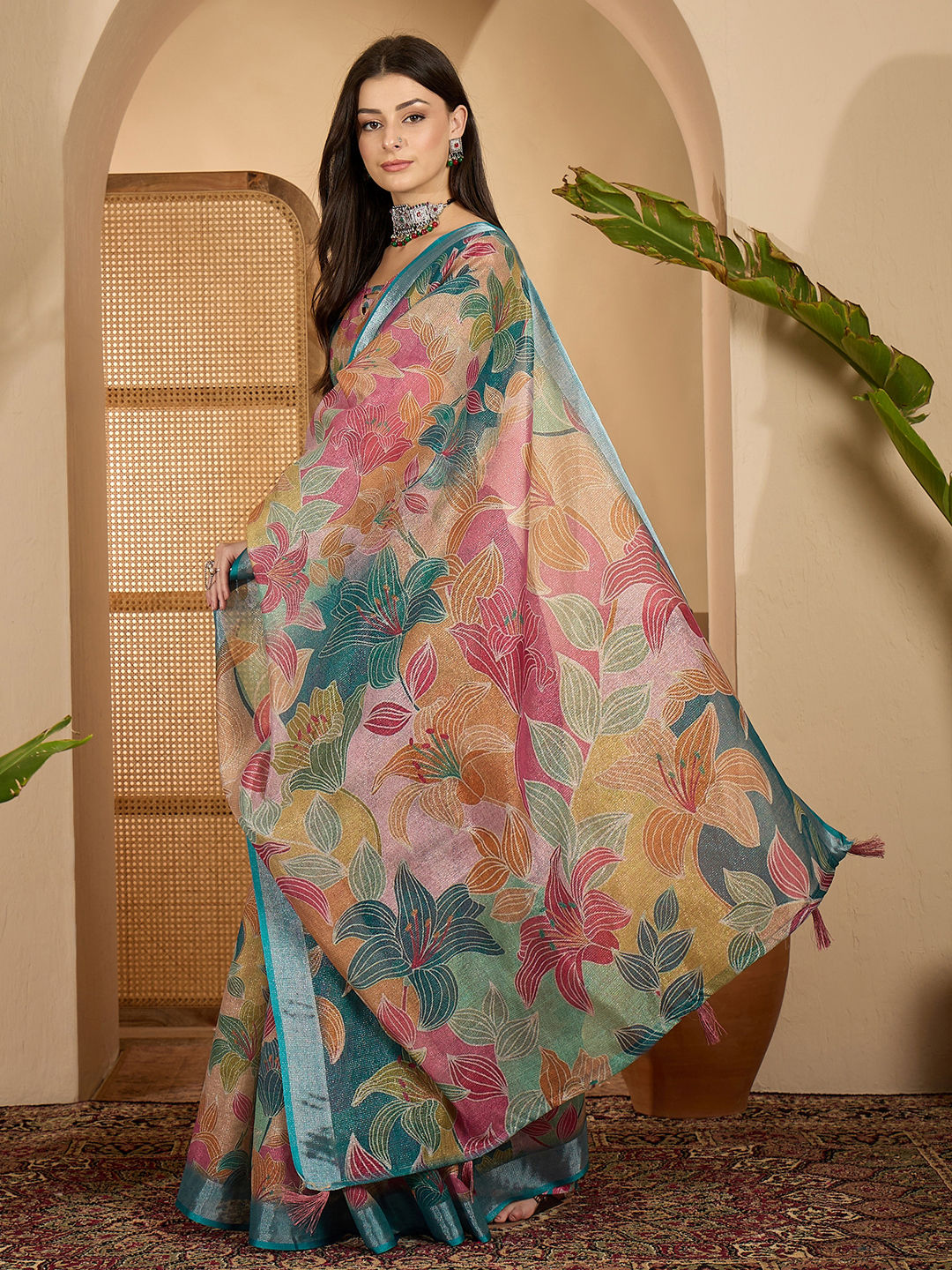 Multicolor color Saree in Linen fabric with Digital Print, Floral, Weaving work
