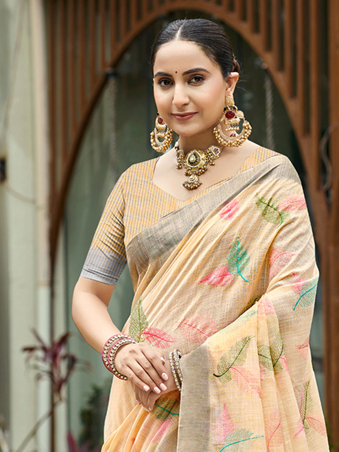 Orange color Saree in Linen fabric with Embroidered, Weaving work
