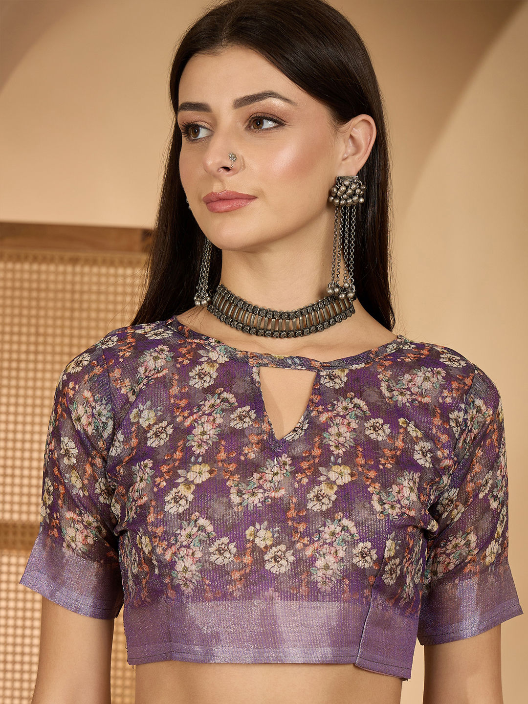 Purple and Violet color Saree in Linen fabric with Digital Print, Floral, Weaving work