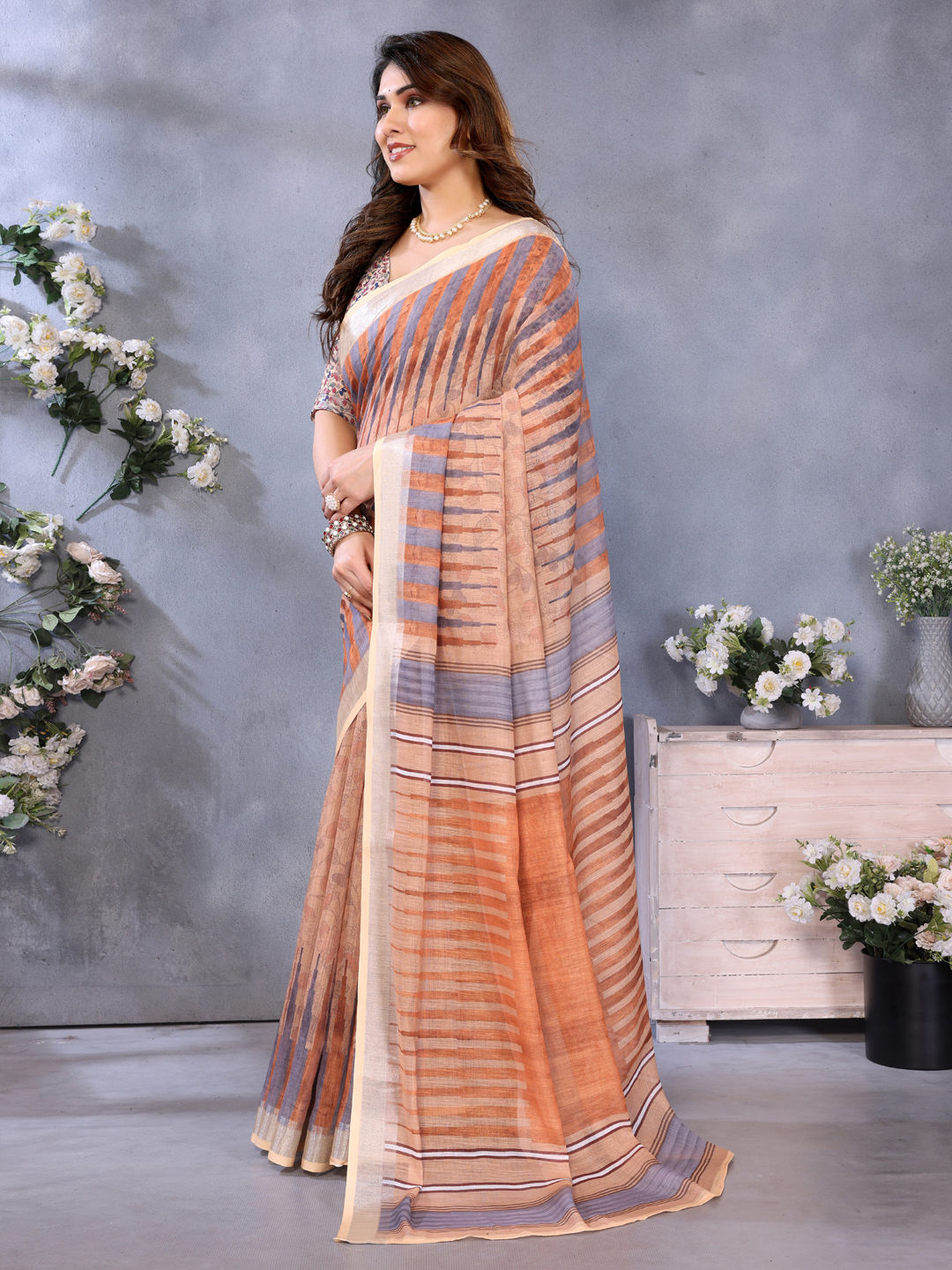 Beige and Brown color Saree in Cotton, Linen fabric with Digital Print, Zari work