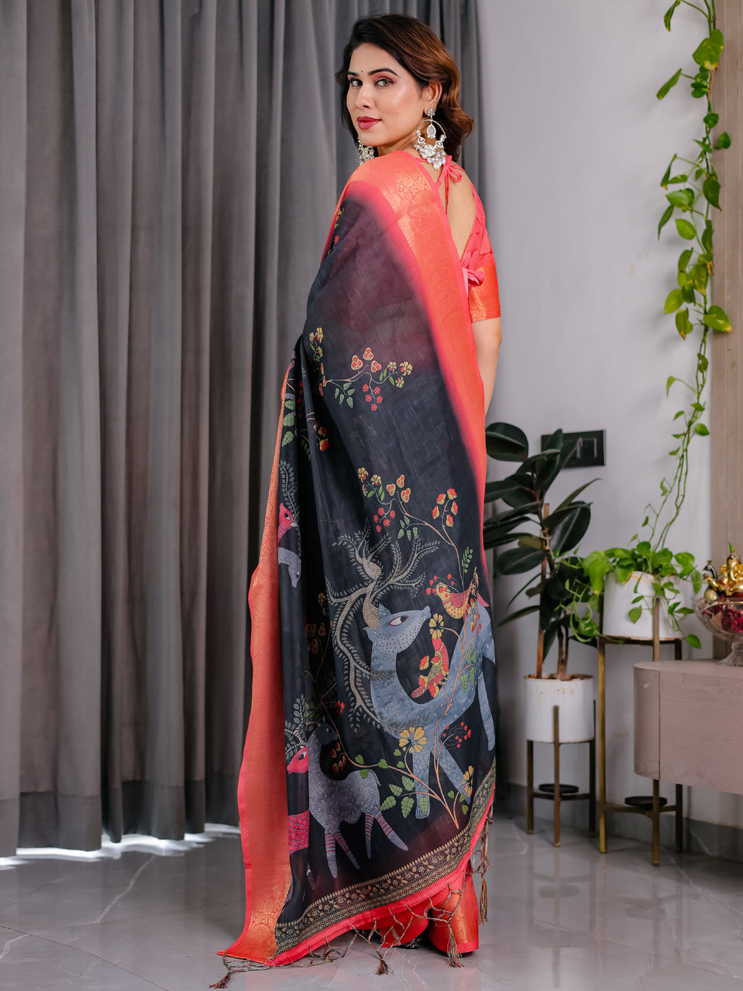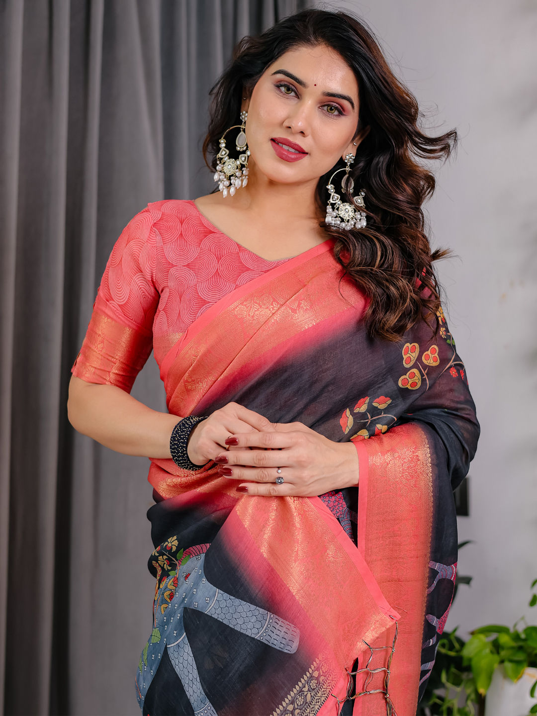 Linen Traditional Saree in Pink and Majenta with Printed work