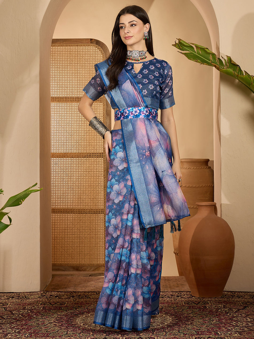 Linen Festive Saree in Multicolor with Floral work