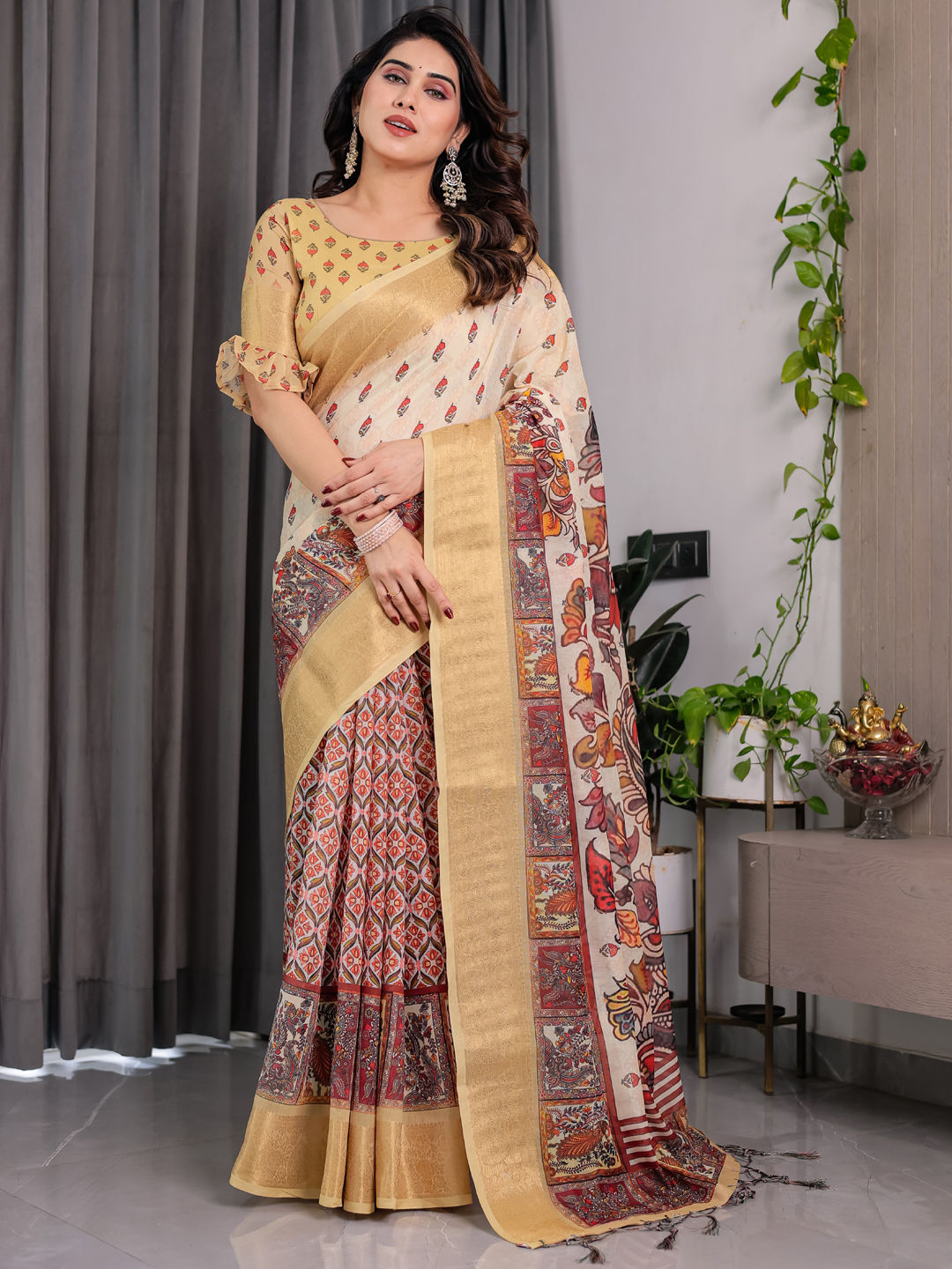 Linen Traditional Saree in Pink and Majenta with Printed work