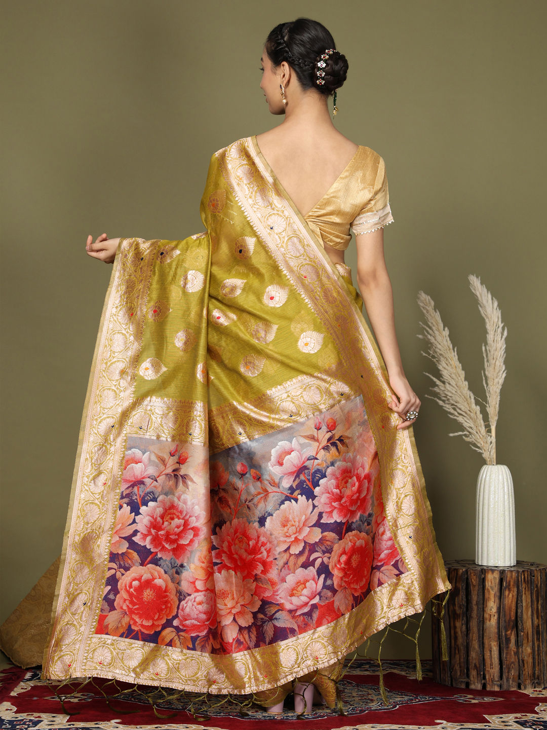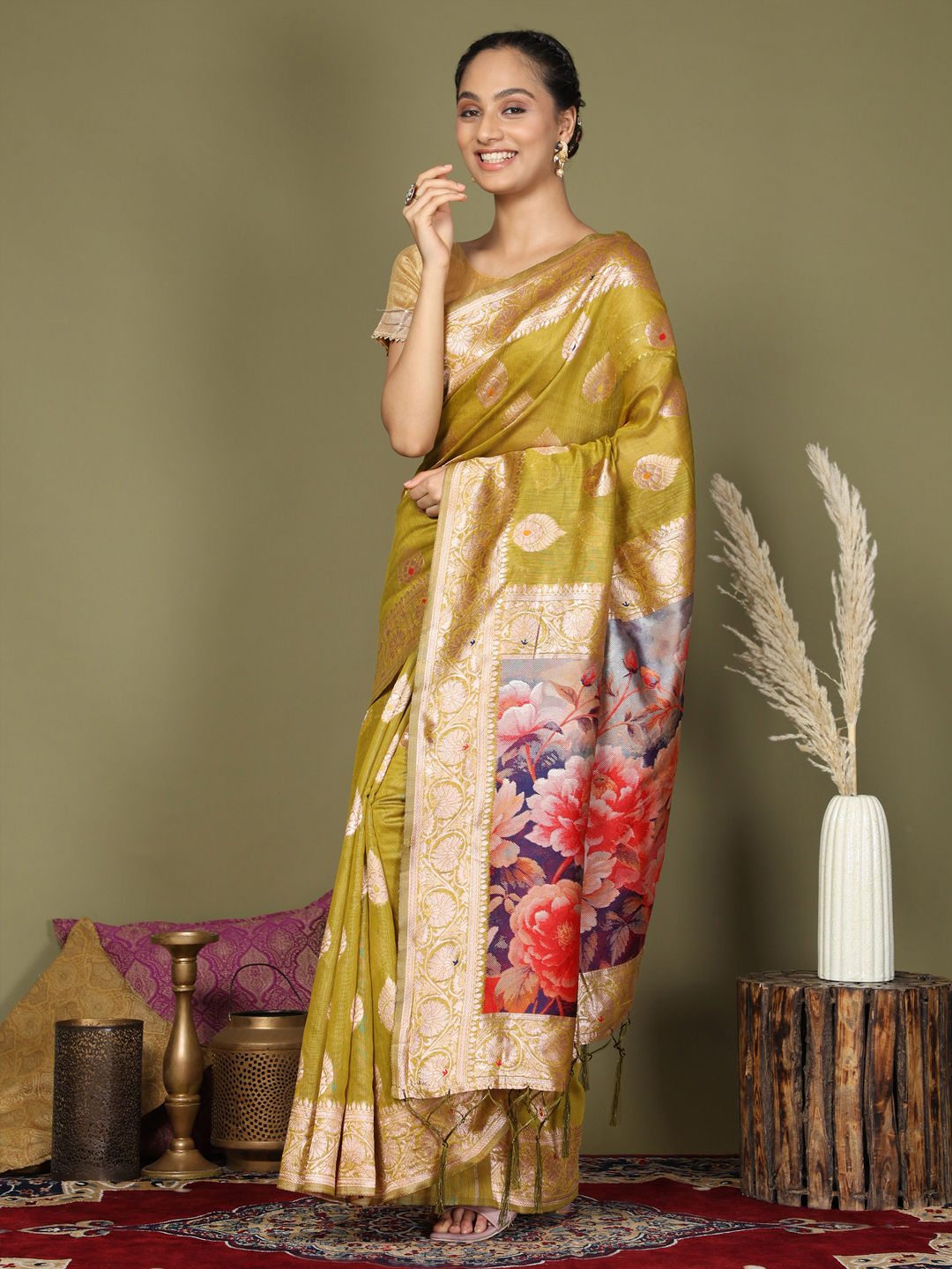 Green color Saree in Cotton, Linen fabric with Weaving work