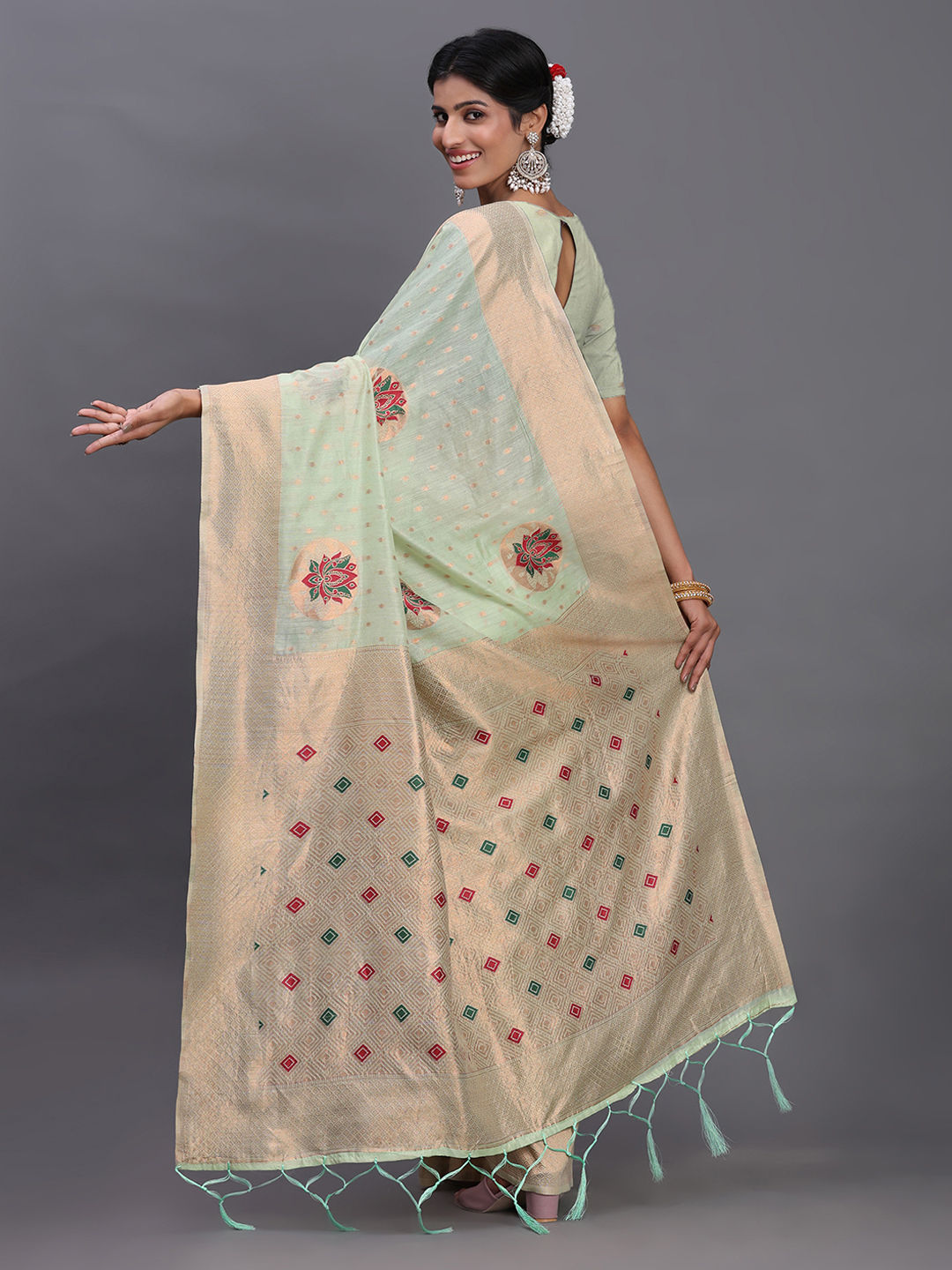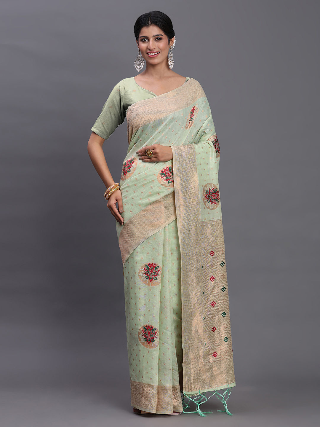 Green color Saree in Cotton, Linen fabric with Weaving work