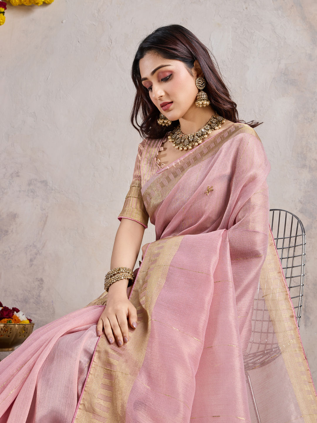 Pink and Majenta color Saree in Linen fabric with Bugle Beads, Cut Dana, Sequence, Weaving work