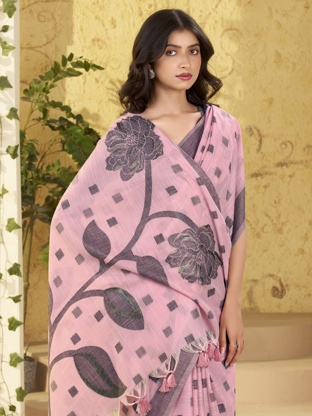 Linen Traditional Saree in Pink and Majenta with Weaving work