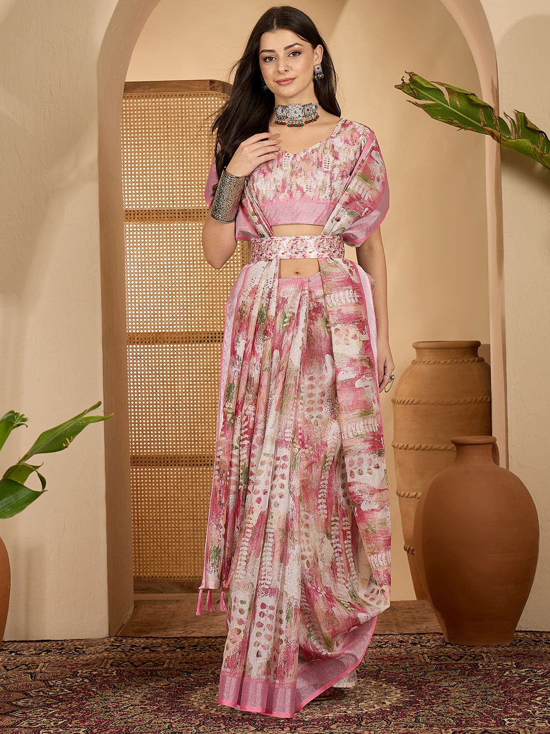 Pink and Majenta color Saree in Linen fabric with Digital Print, Floral, Weaving, Zari work