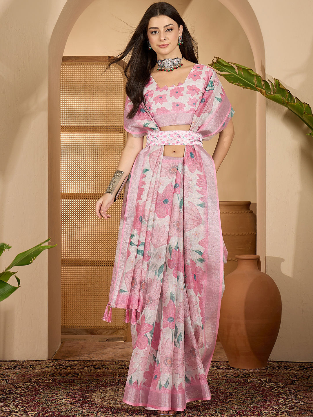 Pink and Majenta color Saree in Linen fabric with Digital Print, Floral, Weaving, Zari work