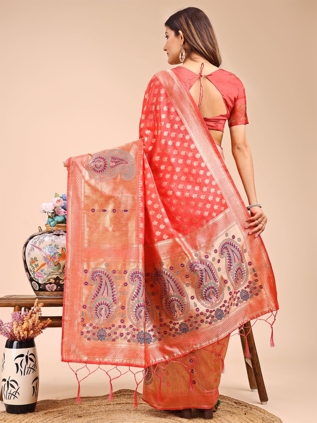 Red and Maroon color Saree in Linen fabric with Weaving work