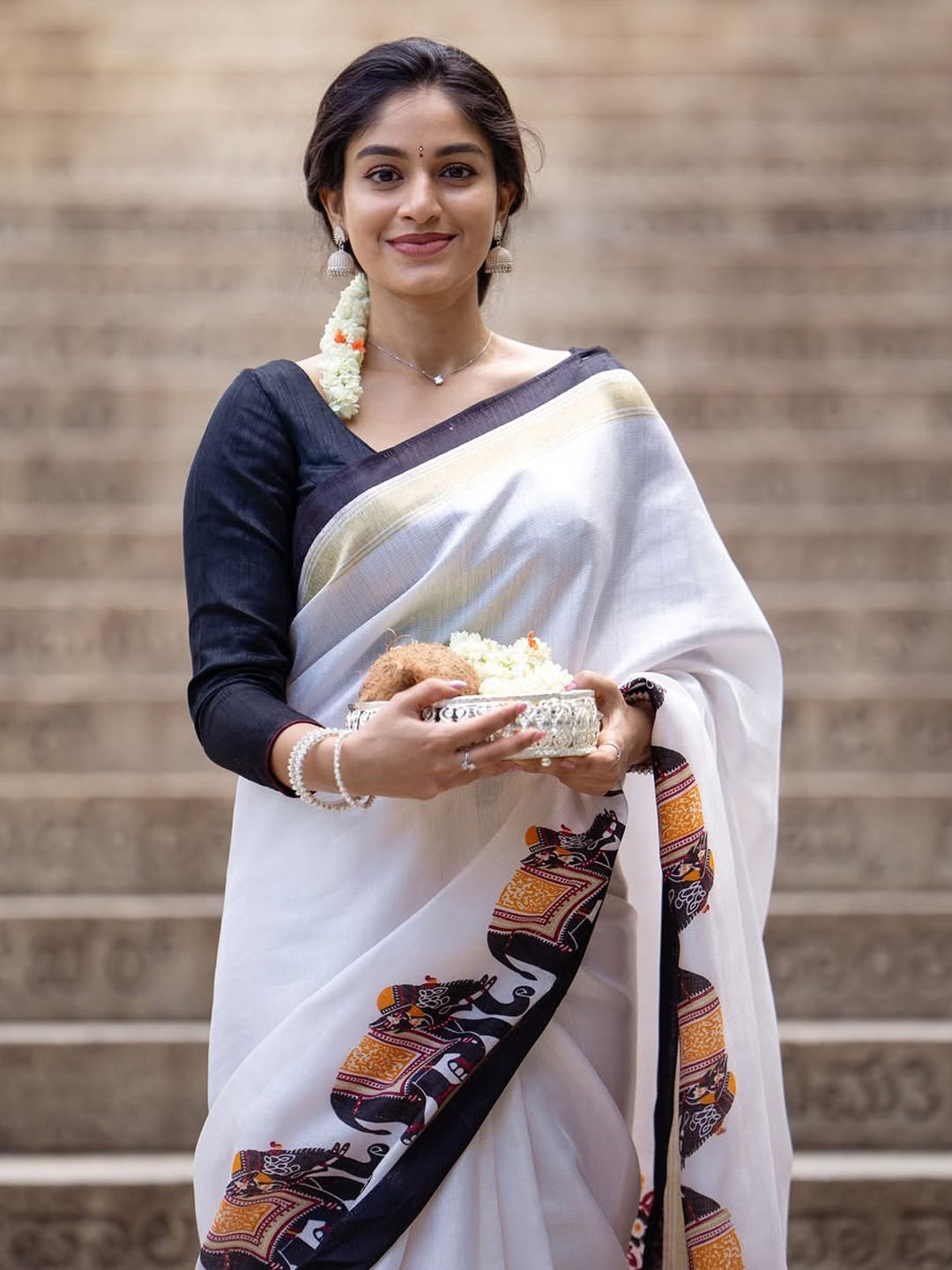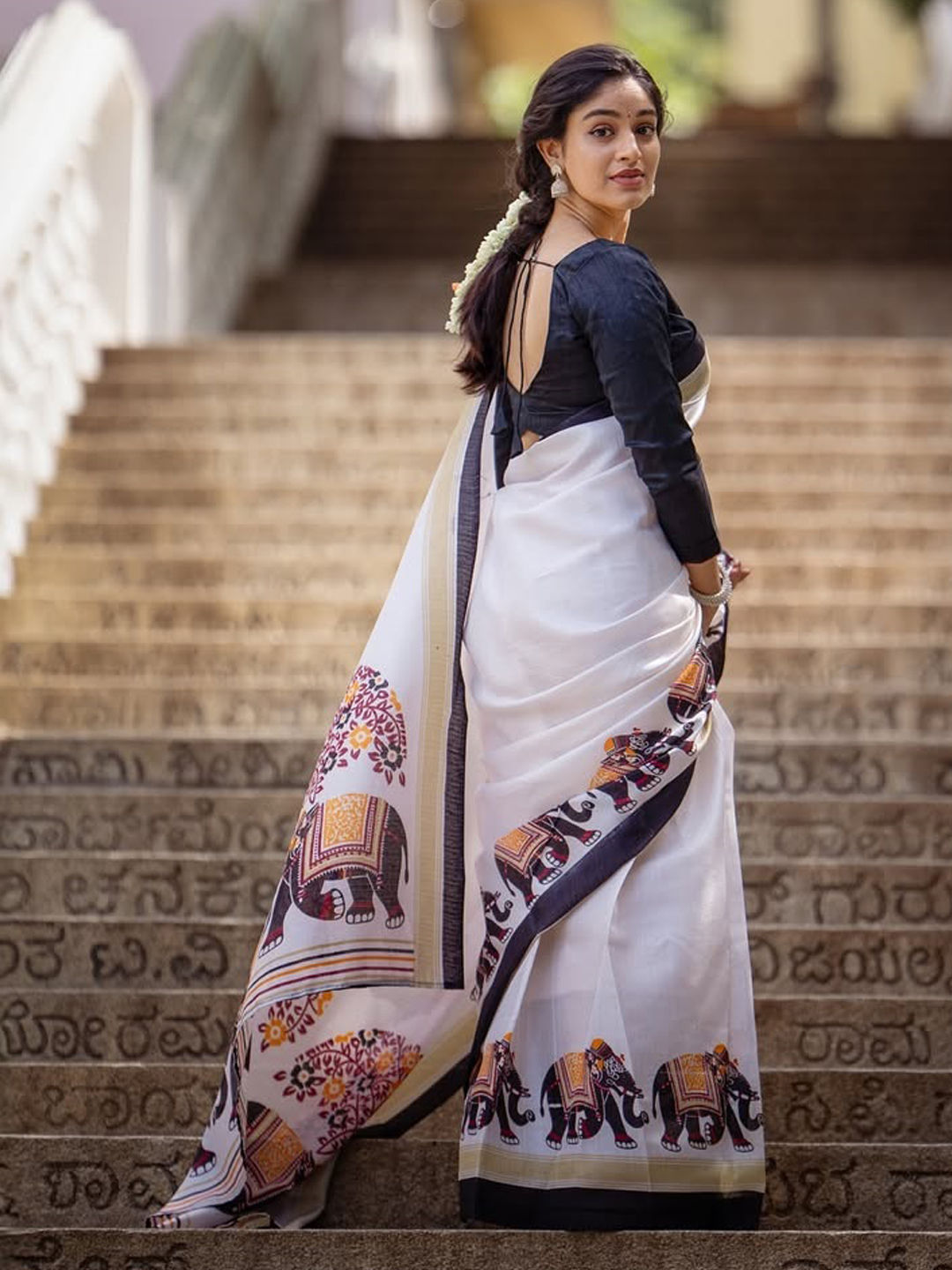 White and Off White color Saree in Cotton, Linen fabric with Digital Print work