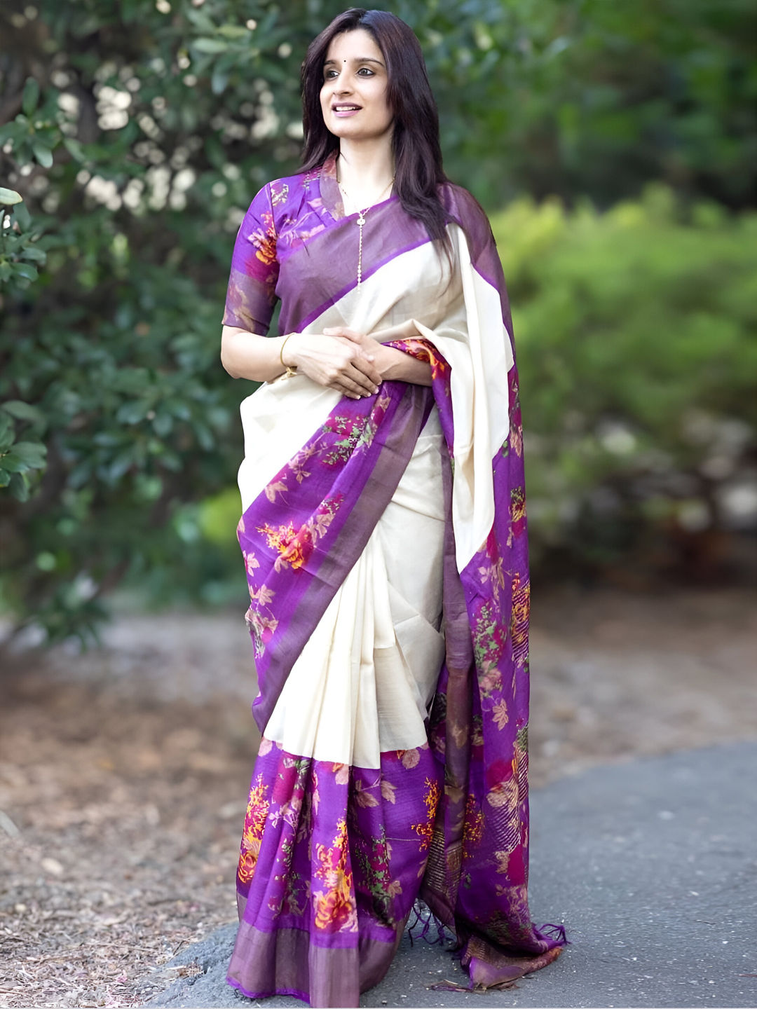 White and Off White color Saree in Linen fabric with Floral, Printed work