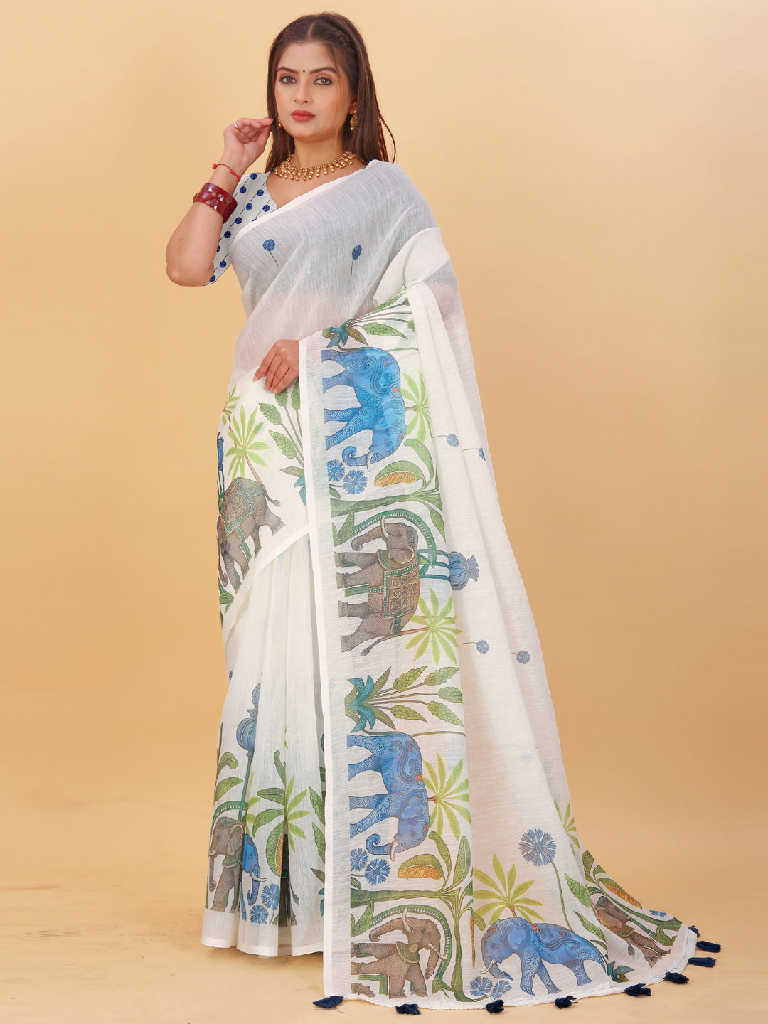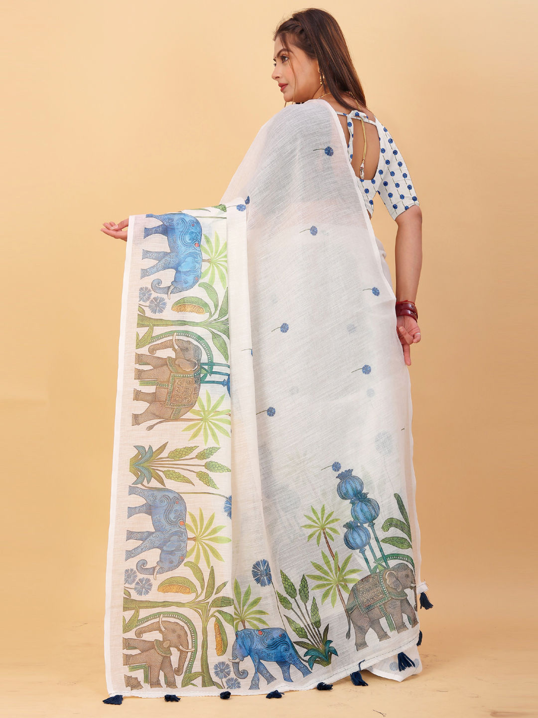 White and Off White color Saree in Linen fabric with Floral, Printed work