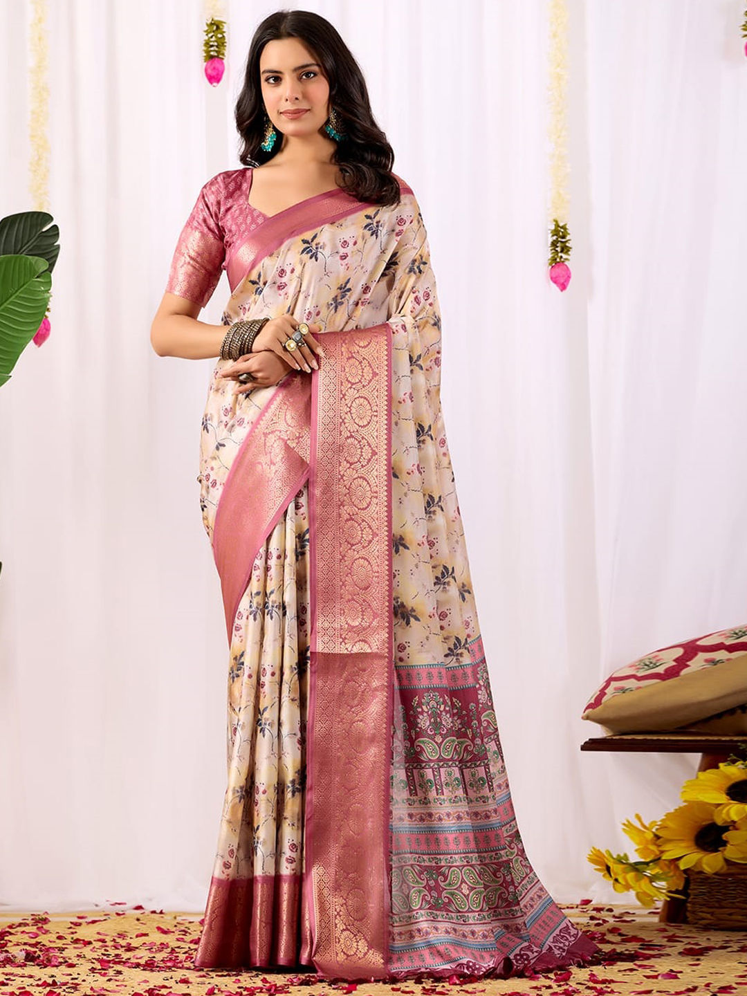 Beige and Brown color Saree in Litchi Silk fabric with Floral, Printed, Weaving work