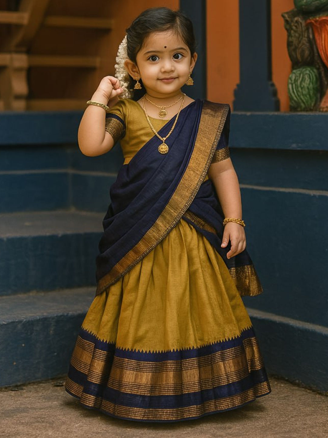 Gold color Kids Lehenga in Litchi Silk fabric with Weaving work