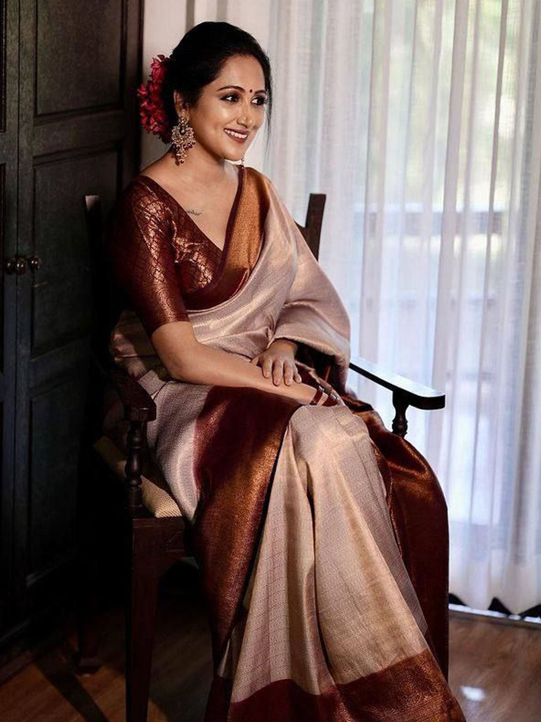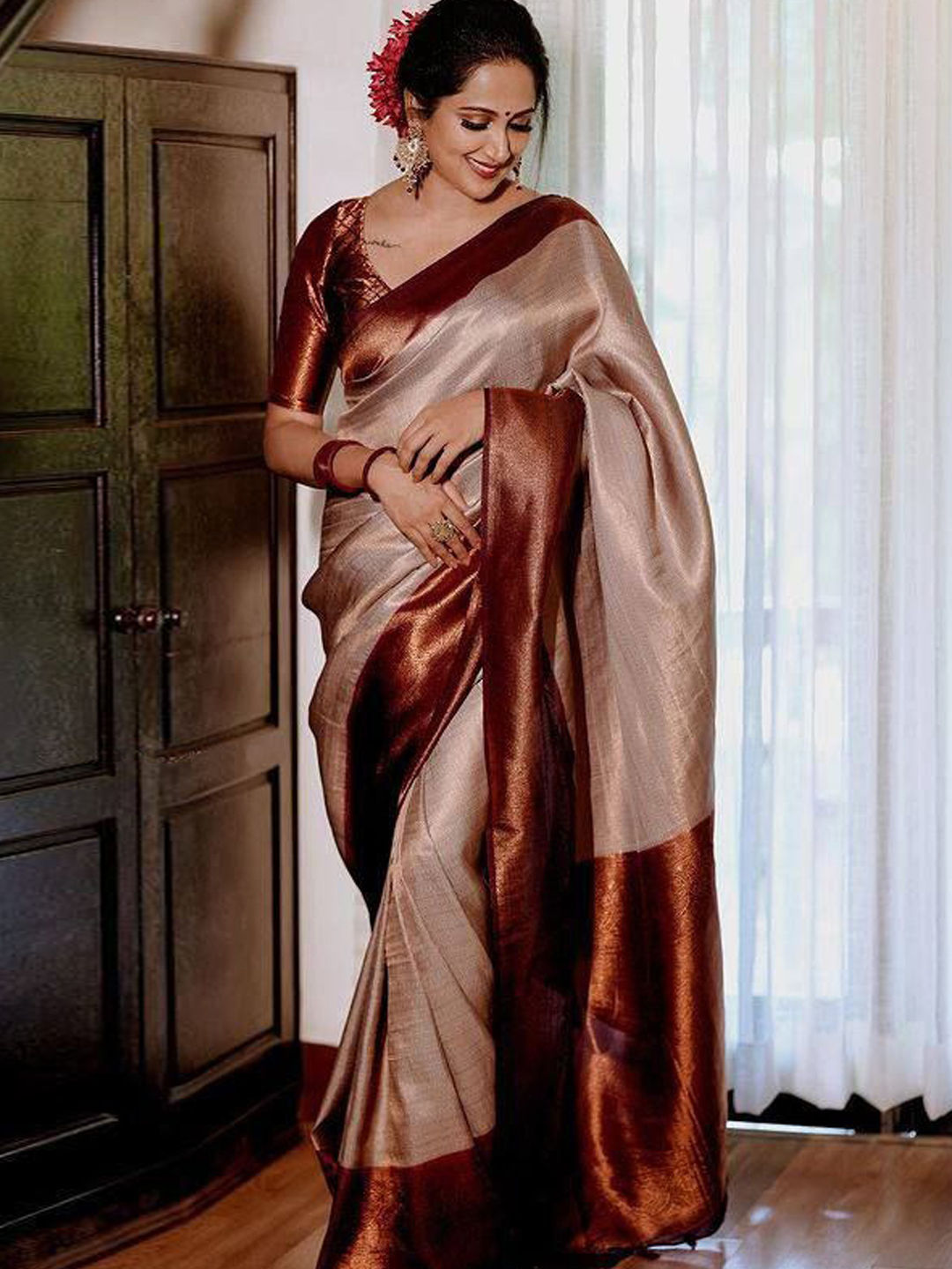 Beige and Brown color Saree in Litchi Silk fabric with Weaving work