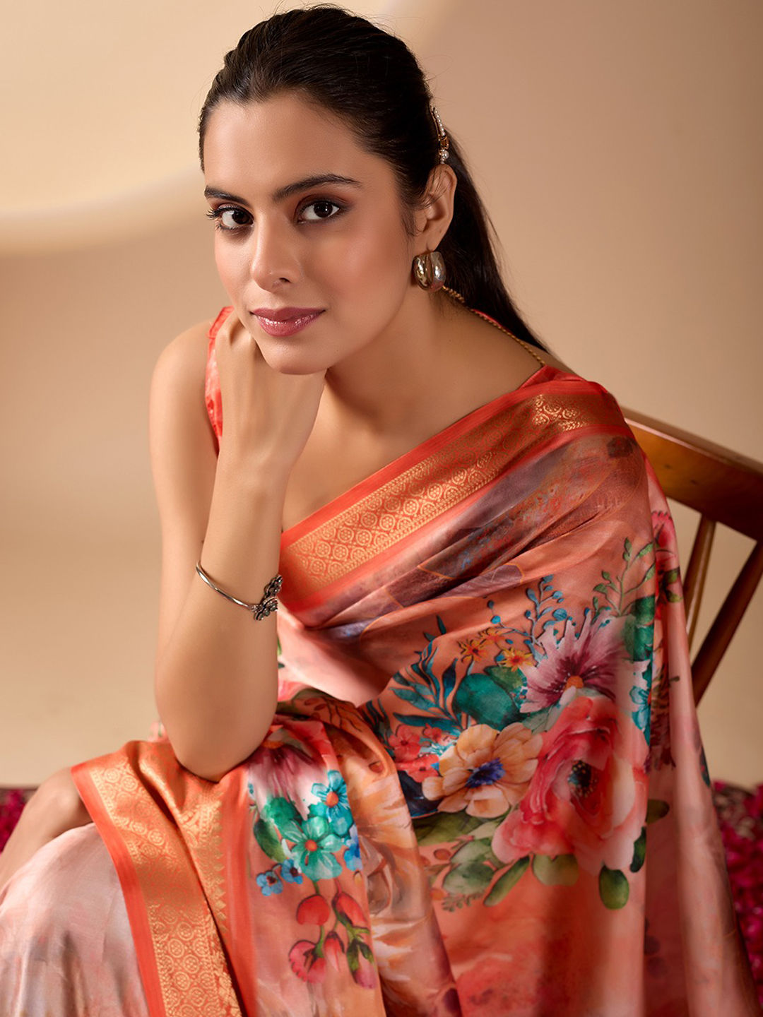 Litchi Silk Traditional Saree in Beige and Brown with Printed work