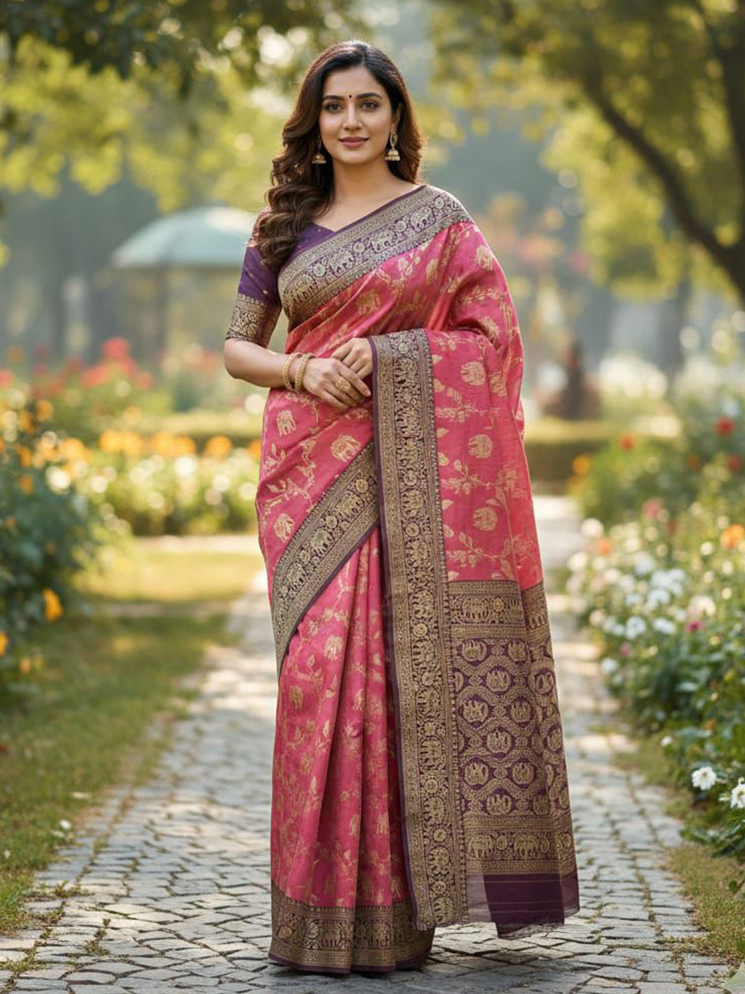 Litchi Silk Traditional Saree in Pink and Majenta with Weaving work