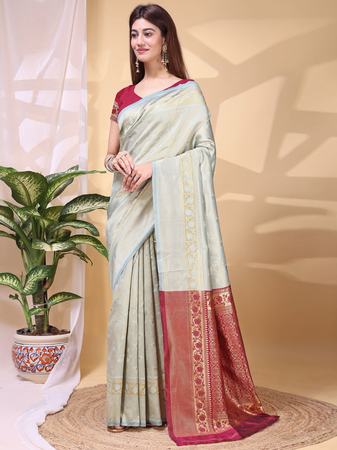 Green, Red and Maroon color Saree in Litchi Silk fabric with Weaving work