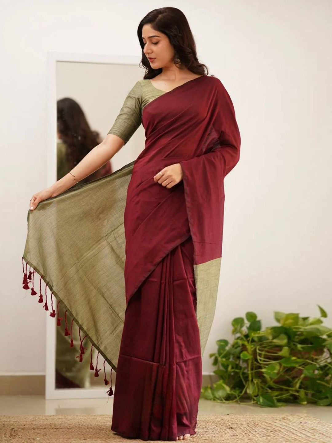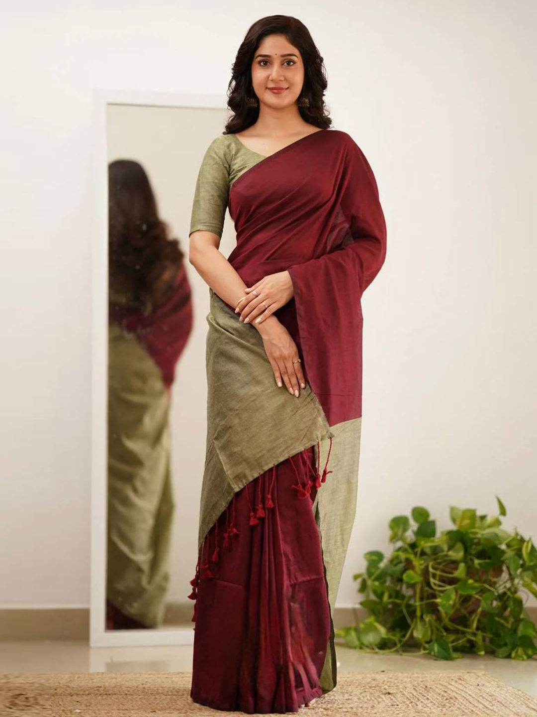 Red and Maroon color Saree in Cotton, Malmal fabric with Printed work