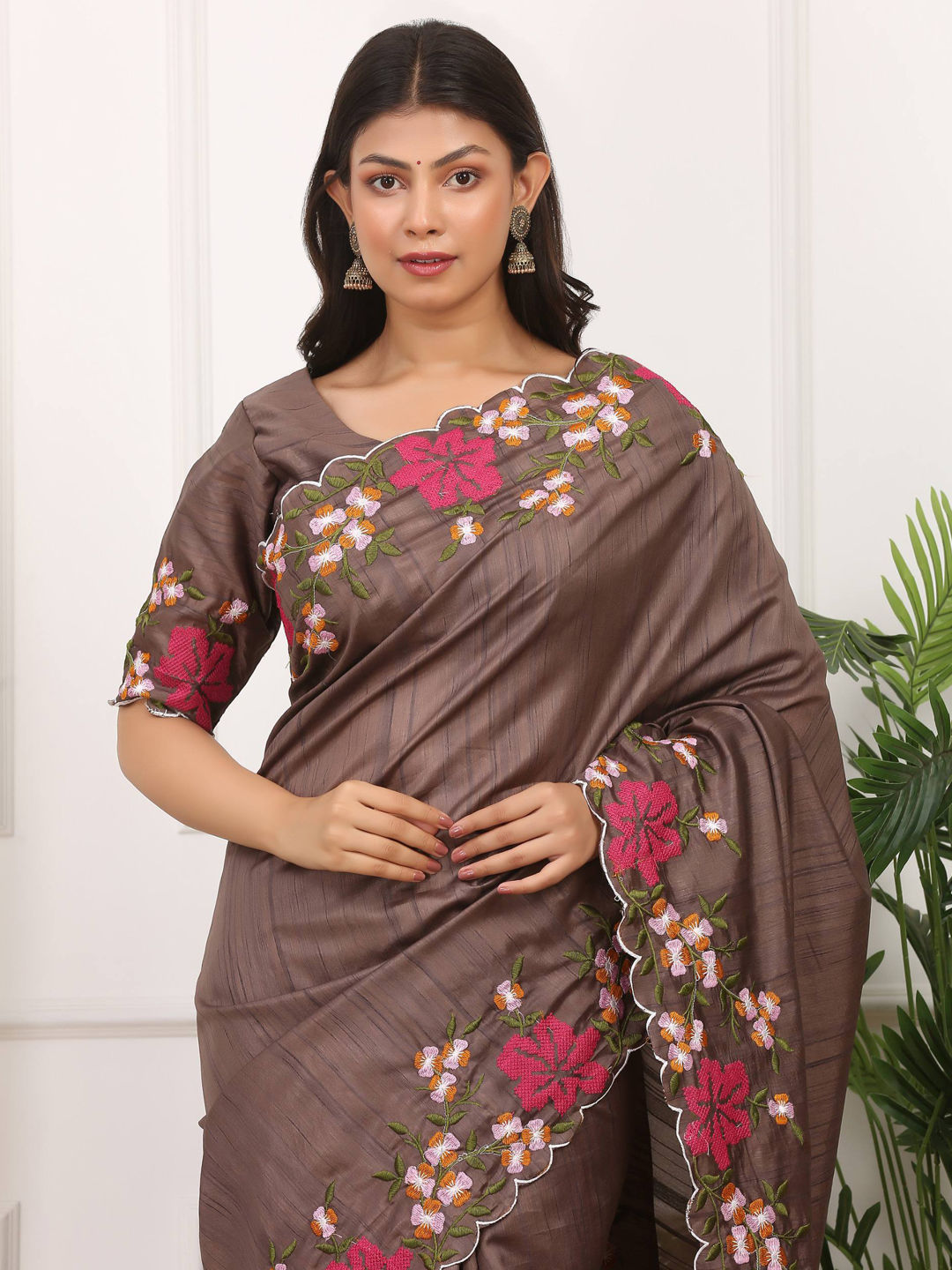 Beige and Brown color Saree in Manipuri Silk fabric with Embroidered, Resham, Thread work