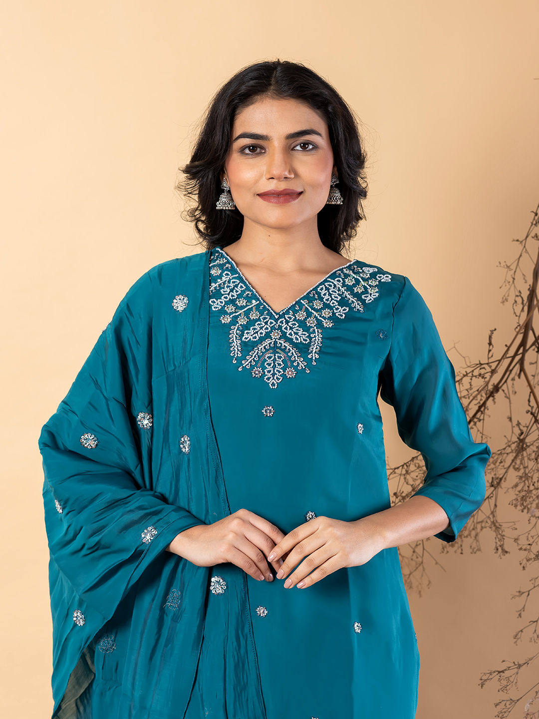 Blue color Salwar Kameez in Mul Chanderi fabric with Bugle Beads, Cut Dana, Thread work