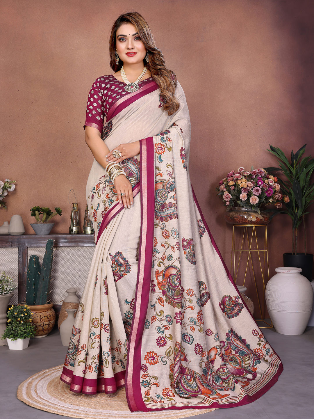 Mul Cotton Traditional Saree in Beige and Brown with Printed work