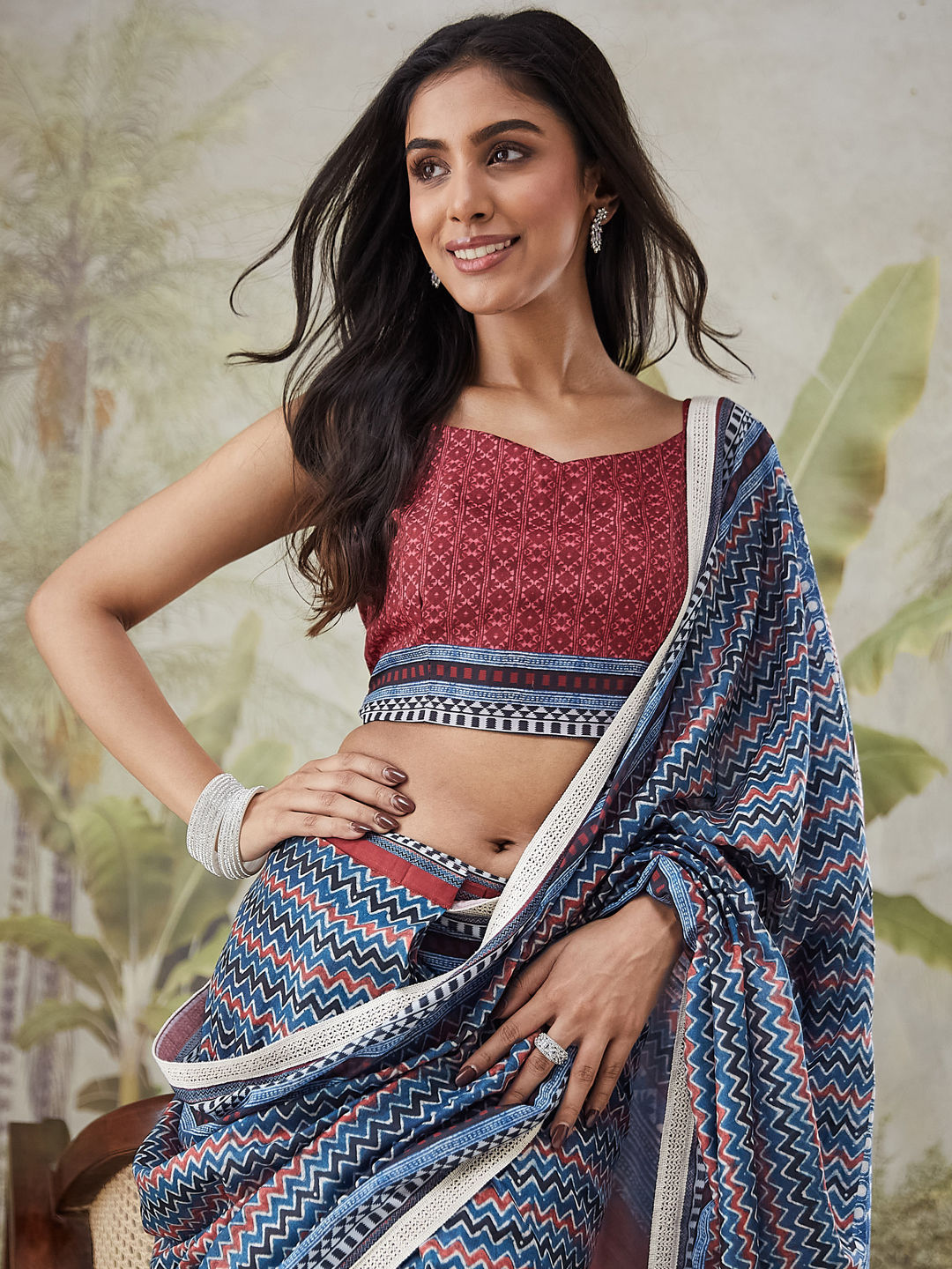 Muslin Festive Readymade Saree in Red and Maroon with Printed work