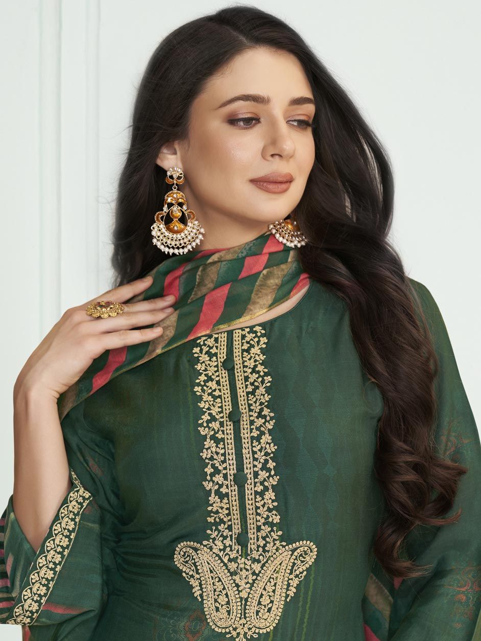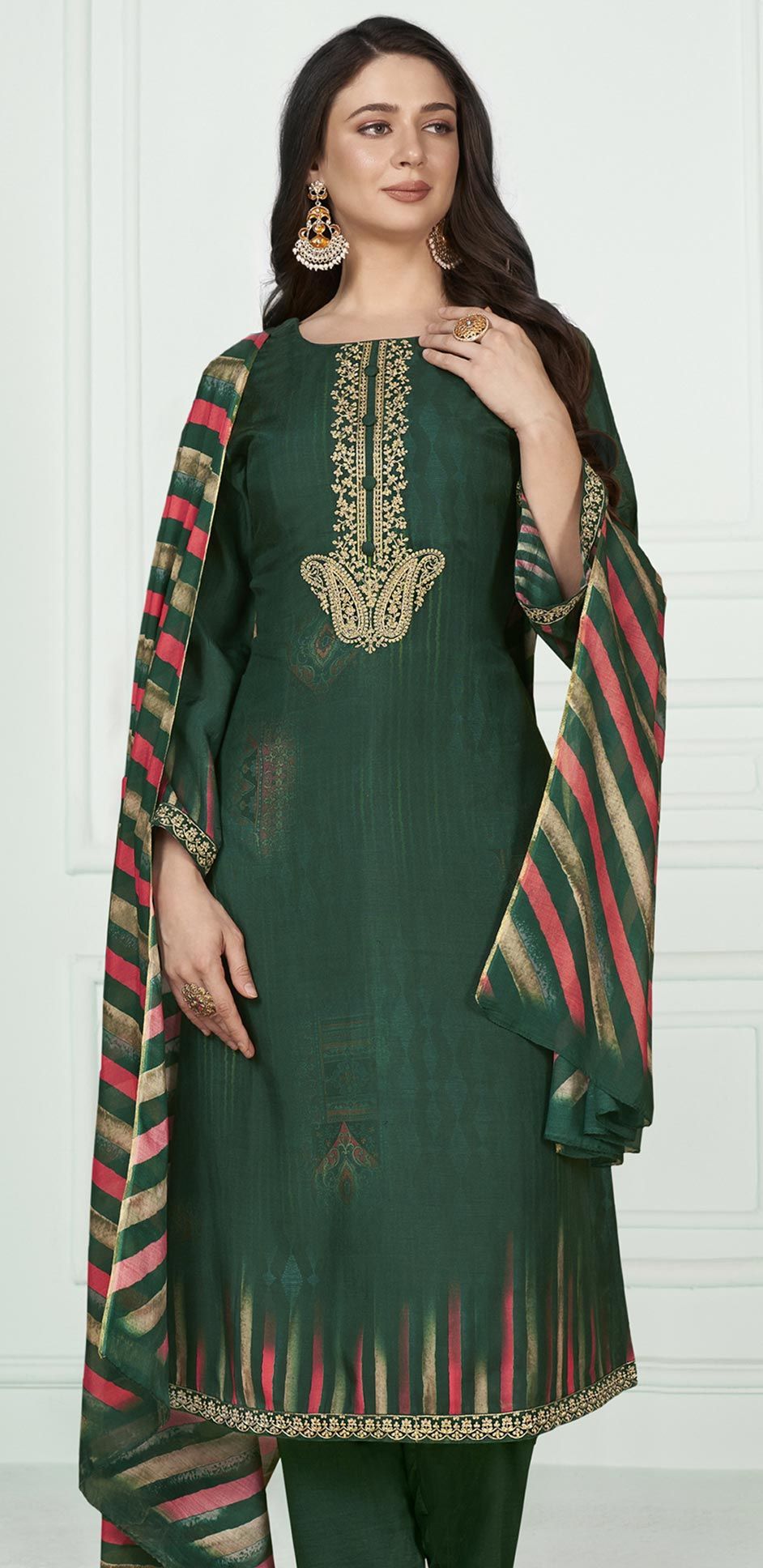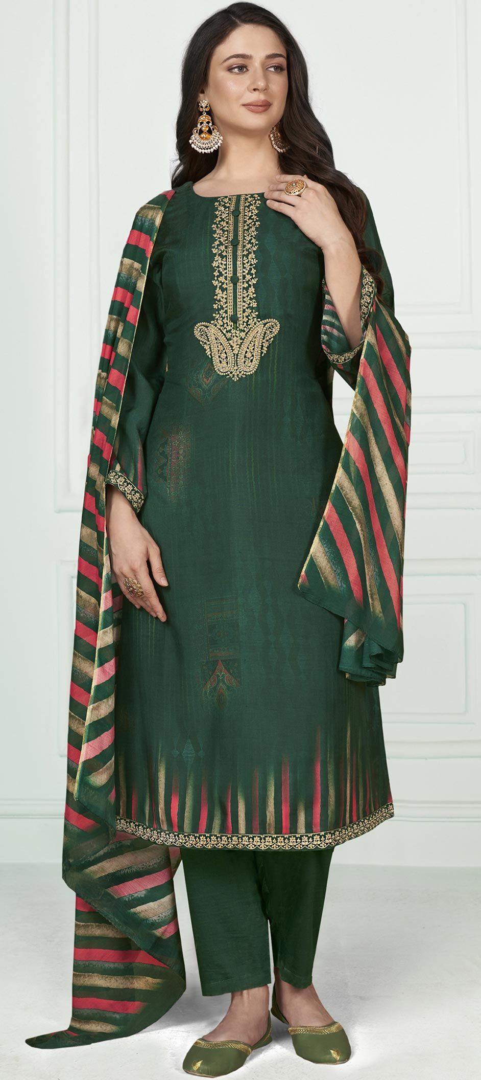 Green color Salwar Kameez in Muslin fabric with Digital Print, Embroidered, Sequence work
