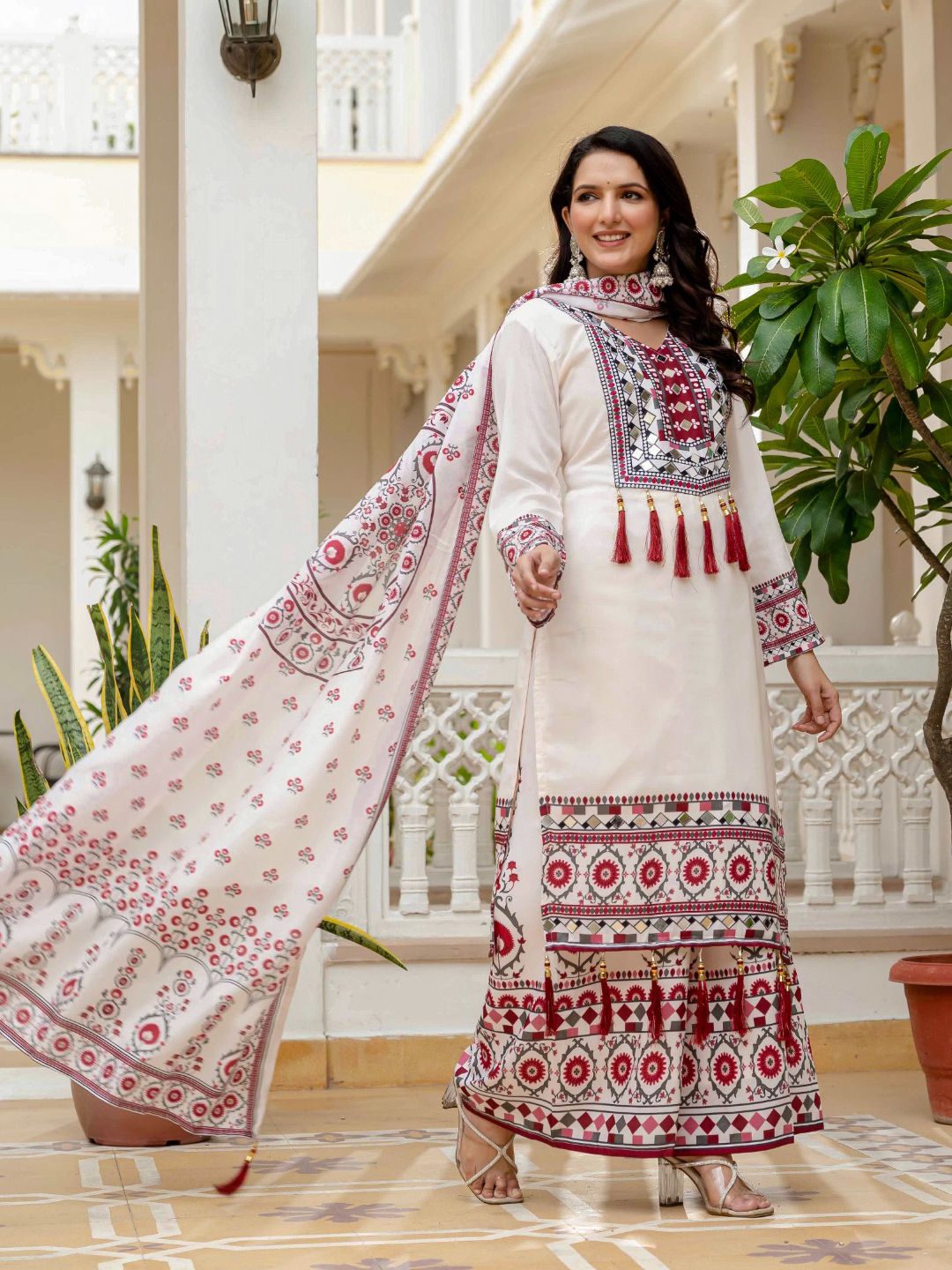 White and Off White color Salwar Kameez in Muslin fabric with Digital Print, Mirror work
