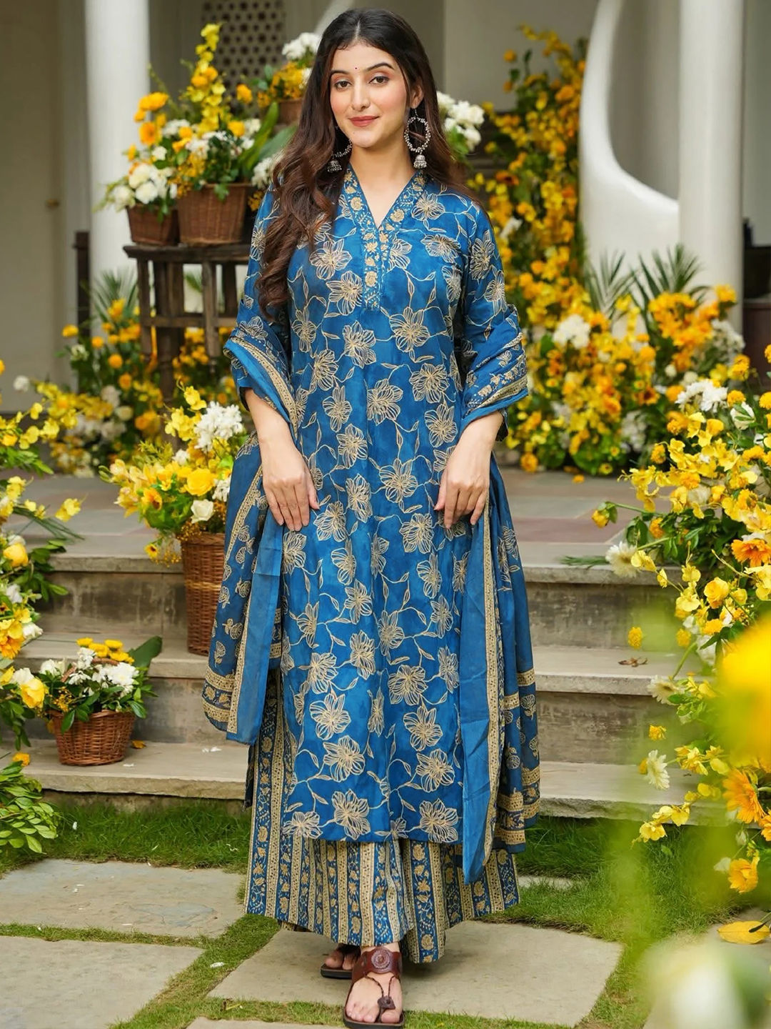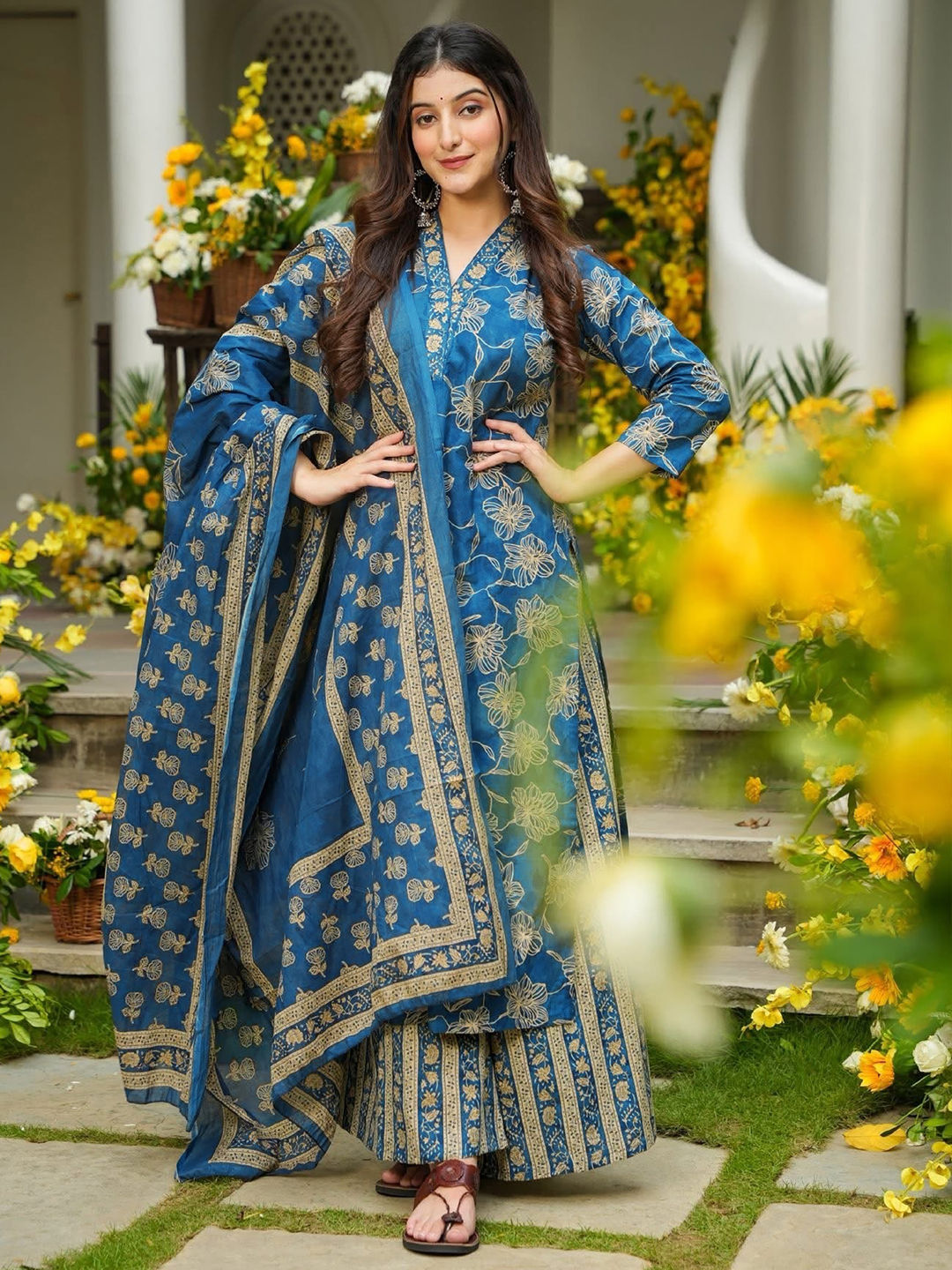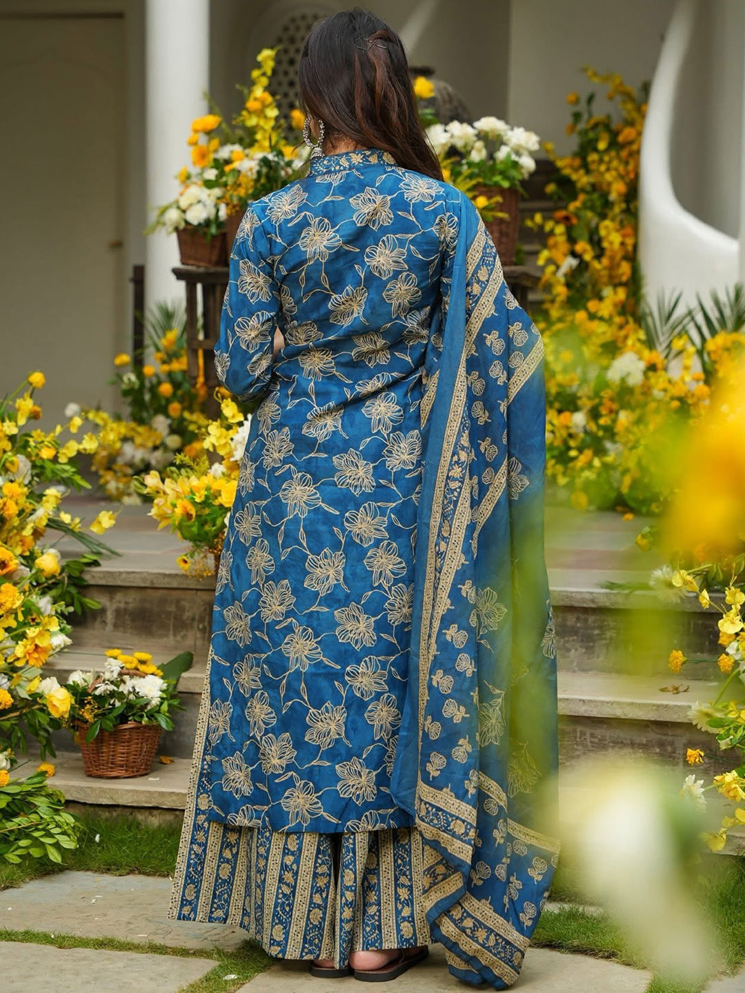 Blue color Salwar Kameez in Muslin fabric with Digital Print, Floral work