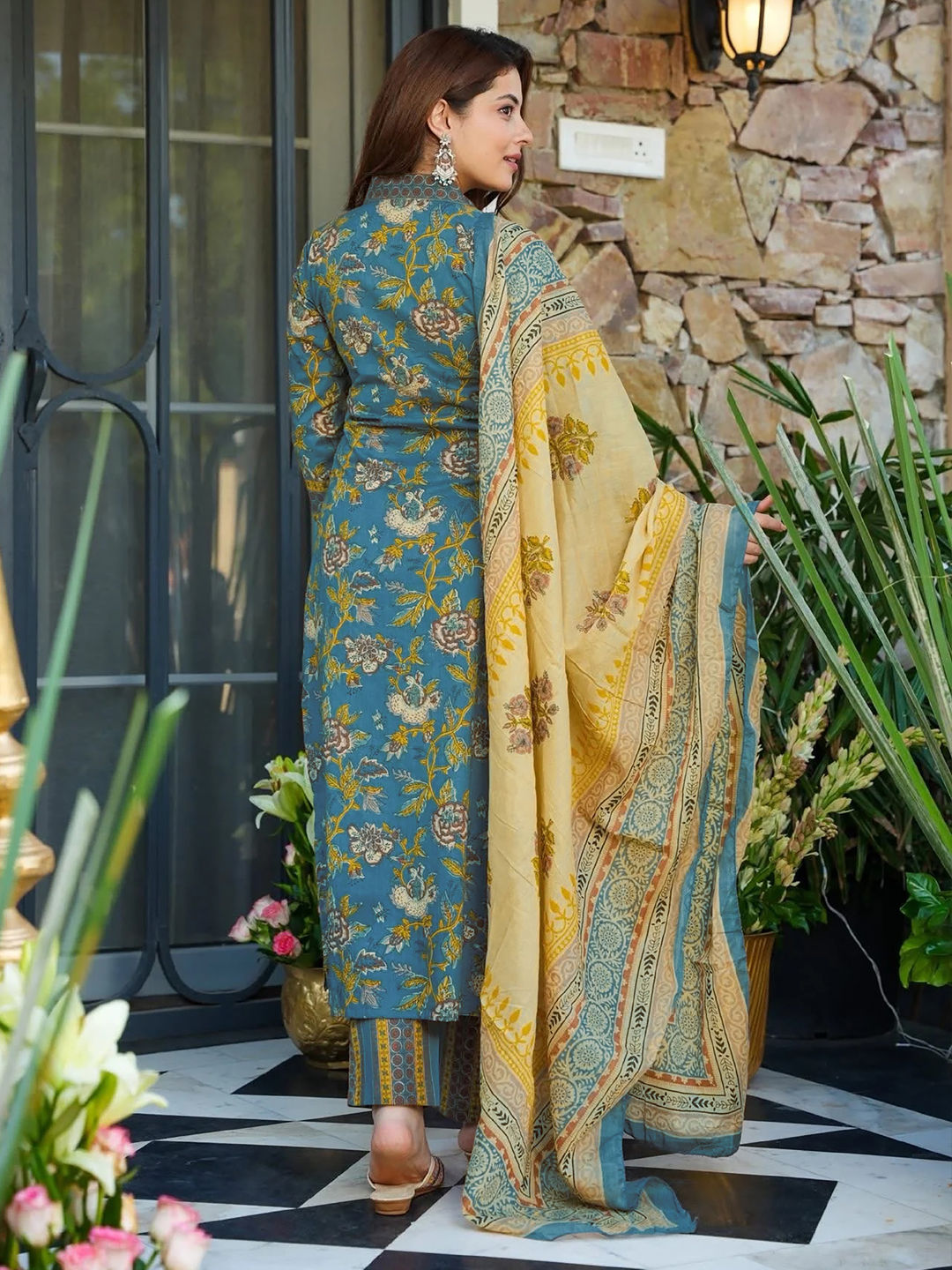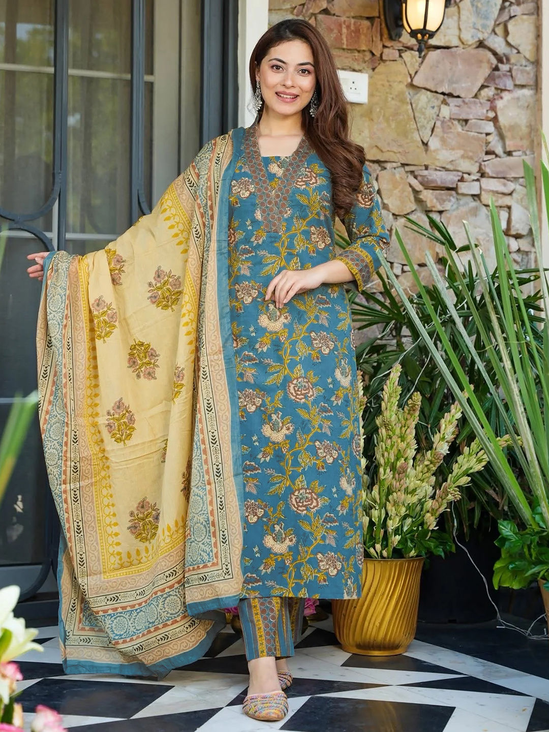 Blue color Salwar Kameez in Muslin fabric with Digital Print, Floral work