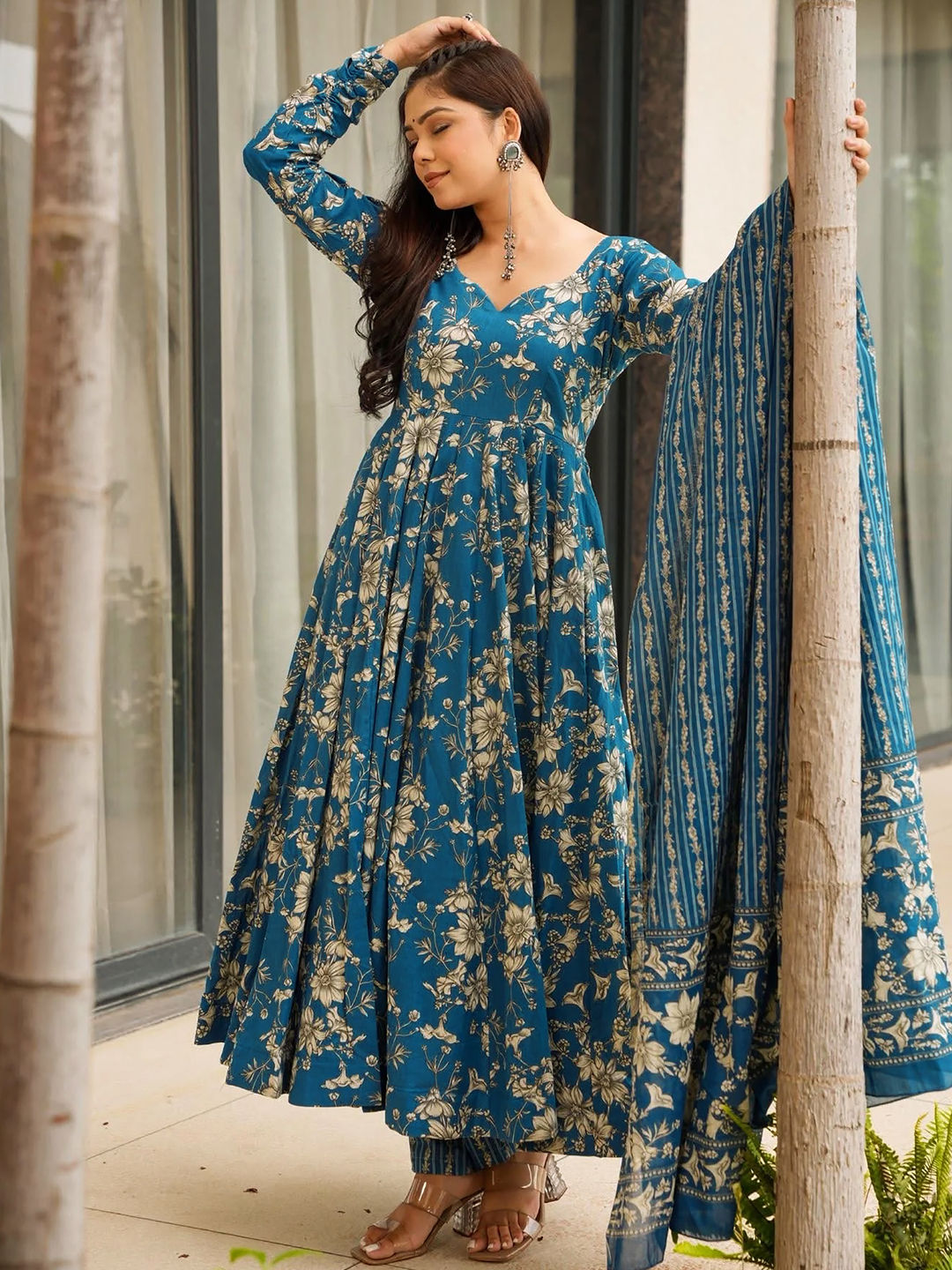 Blue color Salwar Kameez in Muslin fabric with Digital Print, Floral work